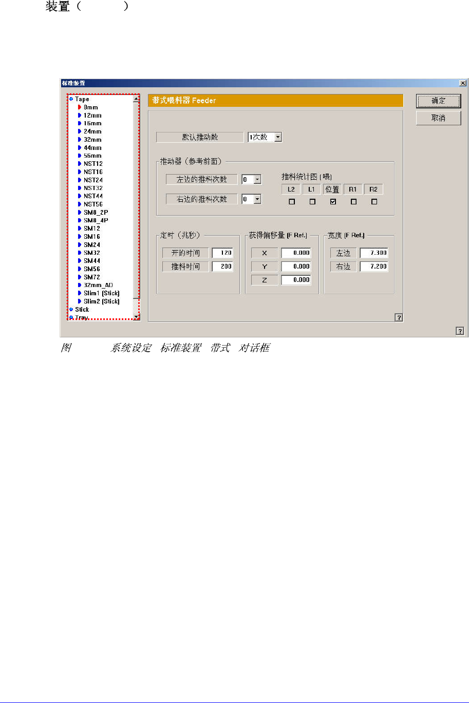15-19 15.5. Device [F1 1] 管理有关带式 , 杆式 , 吸 嘴的数据。 15.5.1. T ape Feeder 15-1 1. “ : - ” 清单框 选择将要设定的装置。 以上画面画面为在装置目录选择 ” 带式 ” 的情况。 设定有关带式喂料器的数据。 < 预设推料次数 > 组合框 选择为了前进带式喂料器需要几次 推料动作的选项。 < 时间 > 领域 < …