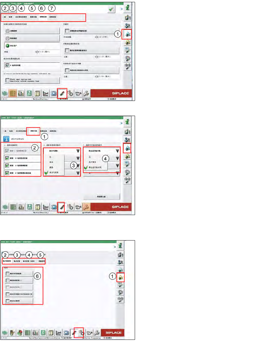 TX系列 技术培训 01/2016 12 贴片机软件概览 12.7 贴片机软件选项概述 203 1. 在这里,可以配置贴片机在特定事件中的行 为。 2. 可以屏蔽贴片机的某些功能(测试) 3. 更改贴片后的PCB检查设置 4. 针对某些错误出现或达到报错数量后的行为 设置(自动 Bug 报告) 5. 吸嘴扫描选项的配置和一旦吸嘴变脏应该采 取的措施 6. 在检测失败后,额外的检查或误差设置(自 动供料器间距检测) 7. 取料和影像错误阀…