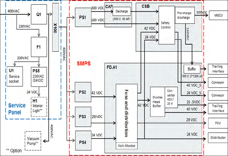 – 电源组PS1将主输入AC电源电压转换为300 VDC(用于主轴的中间电路电压)和160 VDC(用于贴
