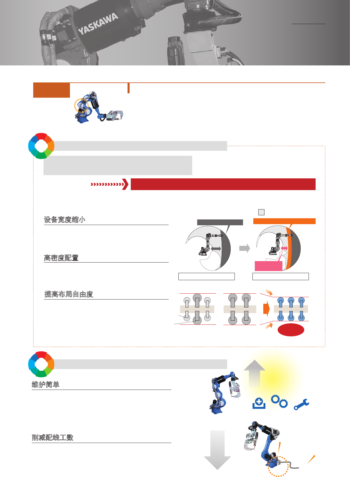 S o lution 1 M OT O MA N - SP Ser ie s MOTOMAN-SP 系列为客户提供了丰富的产品线 MOTOMA N - S P Series 以丰富的产品线智能地解决生产现场的困扰 设备宽度缩小 高密度配置 · 通过扩大有效动作范围,可实现更紧密的设备布局! · 生产线长度缩短,循环时间缩短,节能效果 · 减少工数,提高多品种对应能力 新设备 SP 100 B 在 L 臂中间 追加 E 轴 ■ 动作范围比…