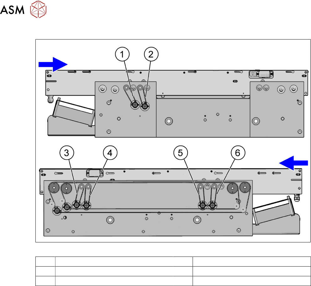 4 Replacing spare parts at the conveyor 4.3 Conveyor drive 52 Service Manual ASM ProcessLens Dual-lane 09/2018 Overview Fig.25: Overview of toothed belts (conveyor drives) 1 Toothed belt input conveyor track 1 2 Toothed…