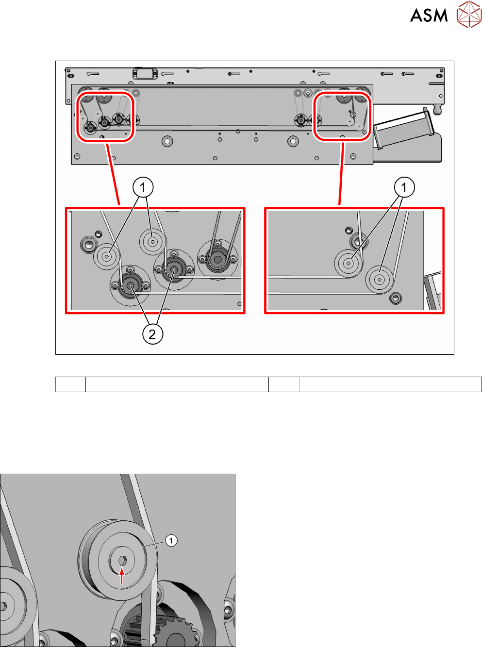 4 Replacing spare parts at the conveyor 4.4 Width adjustment Service Manual ASM ProcessLens Dual-lane 09/2018 59 Overview Fig.33: Overview of idler pulleys (width adjustement) 1 Deflection pulleys 2 Width adjustment mot…