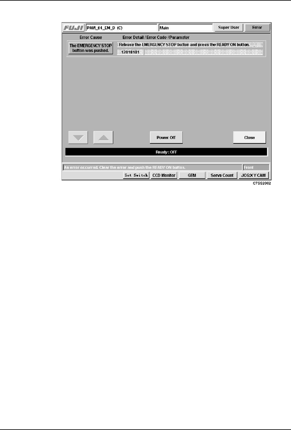 1. If an error occurs, the following error screen displays, and the Ready ON button is