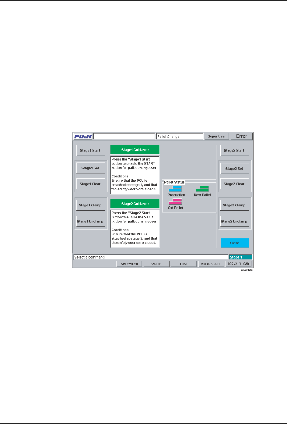 automatically clamps the new device pallet and requests the operator to press [Stage 1
