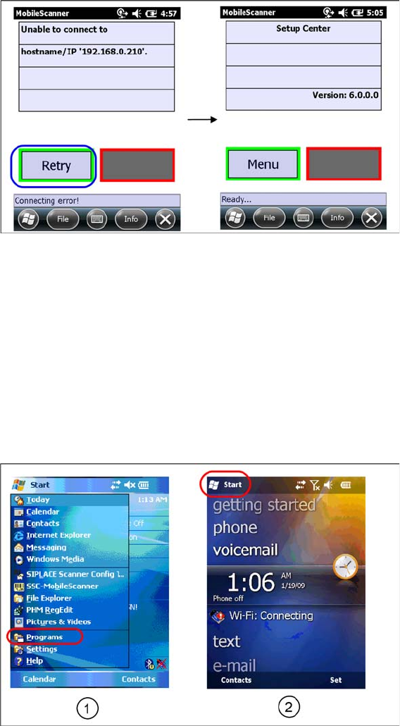 ► Select Start->Programs to show present applications on scanner (select icon (1) for MC70 or Icon