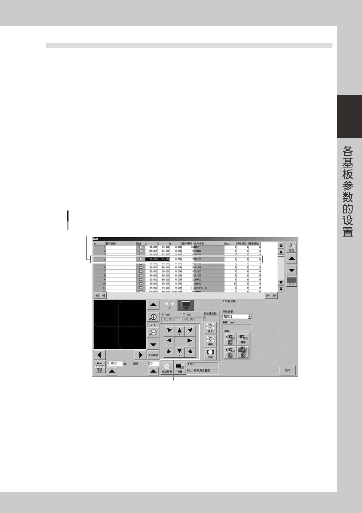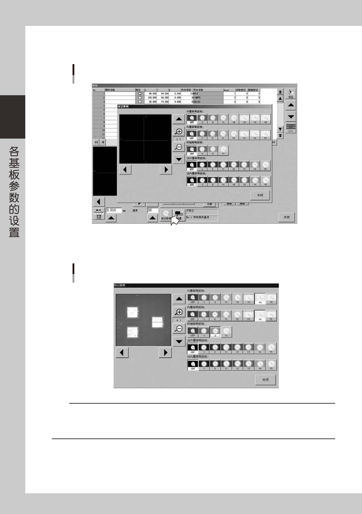 2-62 2 5 调节标记照明。 如果监控屏上没有显示目标对象图像 , 按[标记照明]按钮,调节照明级别。 打开「标记照明」画面 26245-P2-00 外圈照明级别及内圈照明级别为「OFF」或「0」时,选择「+ 4」 ,确认监控屏上的目标对象图像和标记。 同轴照明设置为「0」 。IR 外圈照明、IR 内圈照明是红外线照射,用于有光泽或表面凹凸不平的元件。 照明级别的调整 26246-P2-00 参考 照明有「外圈照明级别」 「内圈照明…