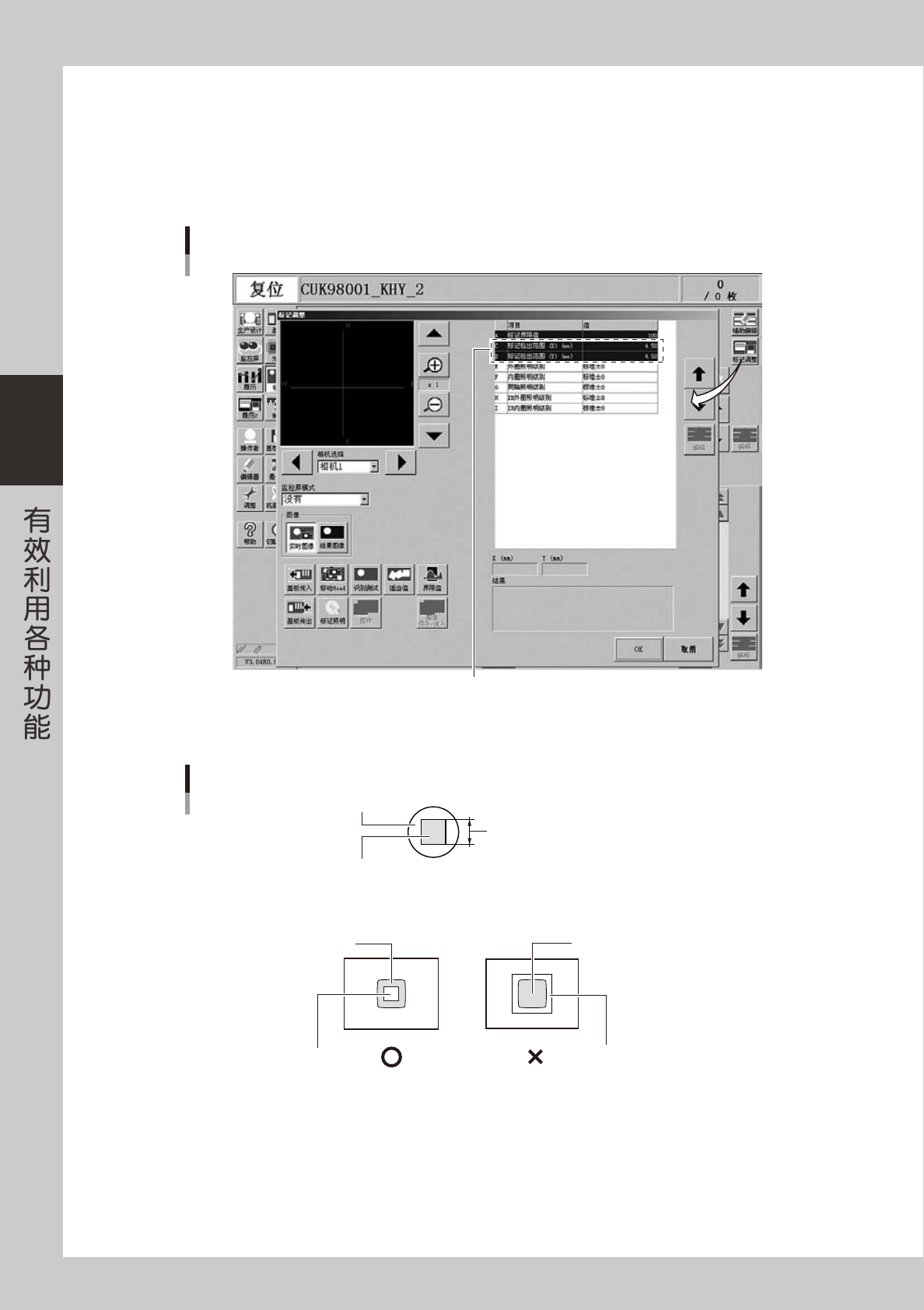 3-5 3 3 输入图像处理信息。 在「标记」画面选择「识别」选项卡,选择表面类型。标记比基板亮时设置为「反光体」 ,暗时设置为 「非反光体」 。 参考 标记界限值 : 通过辅助调整求取适当值。在此使用初始值即可。 坏板标记功能仅判断标记有无,标记本身的形状大小等不在判断范围内。 标记信息画面 表面类型与界限值 26448-P2-00 4 将基板固定在传送带上。 按[标记调整]按钮,打开标记调整画面,按[基板传入]按钮,将基板固定在传送…