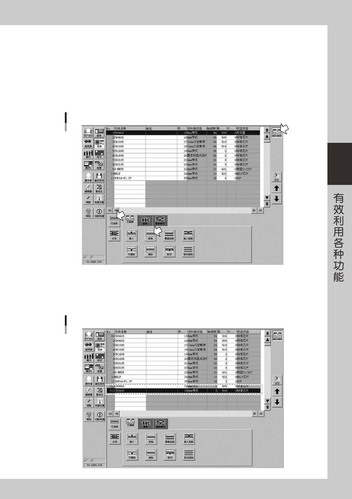 3-1 1 3 2.1.2 替代元件的设置方法 1 选择需要替代的元件。 按 [ 辅助编辑 ] 按钮,显示编辑画面。 从画面上侧的元件列表中选择需要替代的元件,按[行选择]按钮。 2 按[复 制]按 钮 。 按[复制]按钮后,再次按[行选择]按钮,解除行选择。 替代元件的选择 26404-P2-00 3 复制至元件列表最终行的下一行。 将光标移至元件列表最终行的下一行。按 [ 覆盖粘贴 ] 按钮将数据复制到「No12」和「No13」 …