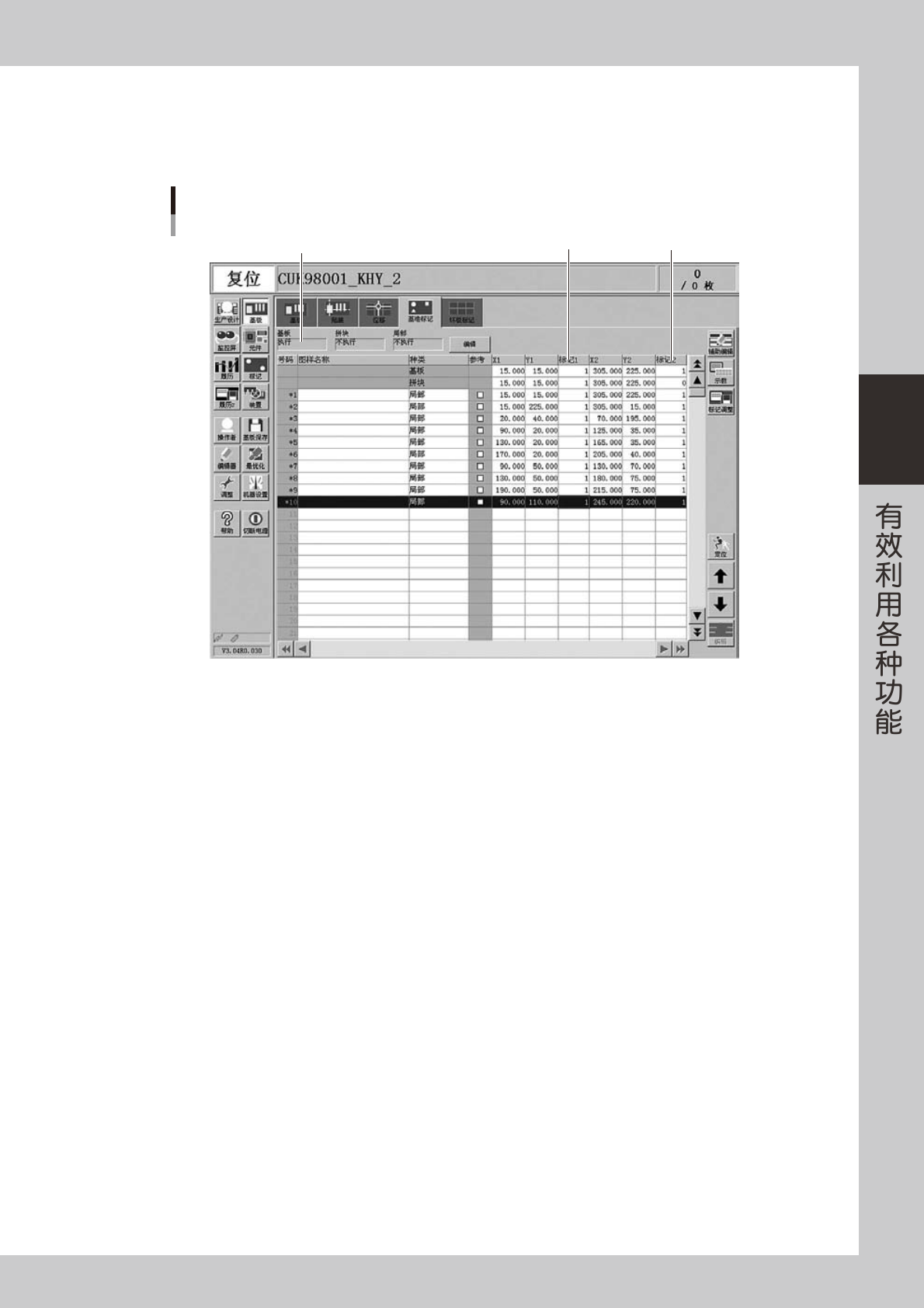 3-19 3 3.1.2 图样匹配的使用方法 图样匹配可以与基准标记同样使用。此时,只需在[基板]-「基准标记」画面的「标记 1」和「标记 2」中输入 已进行图样登录的标记 No.。( 图样匹配作为基板基准标记使用的示例如下图所示 ) 在「标记1」和「标记2」输入图样登录的标记No. 设置为「执行」 图样匹配的使用方法 26411-P2-00