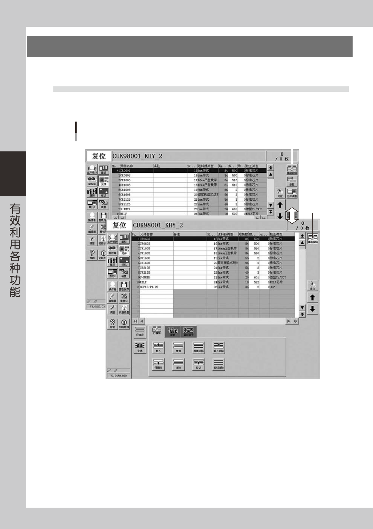 按元件画面右上方的 [ 辅助编辑 ] 按钮,将画面切换至编辑画面,显示查找·置换等选项卡。要返回普通画面时,
