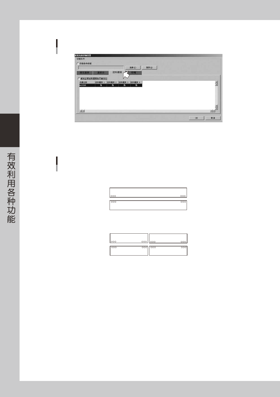 选择框。使用任意送料器架时,删除「使用全部送料器架执行最优化」的选中标记后,选中要使用送料