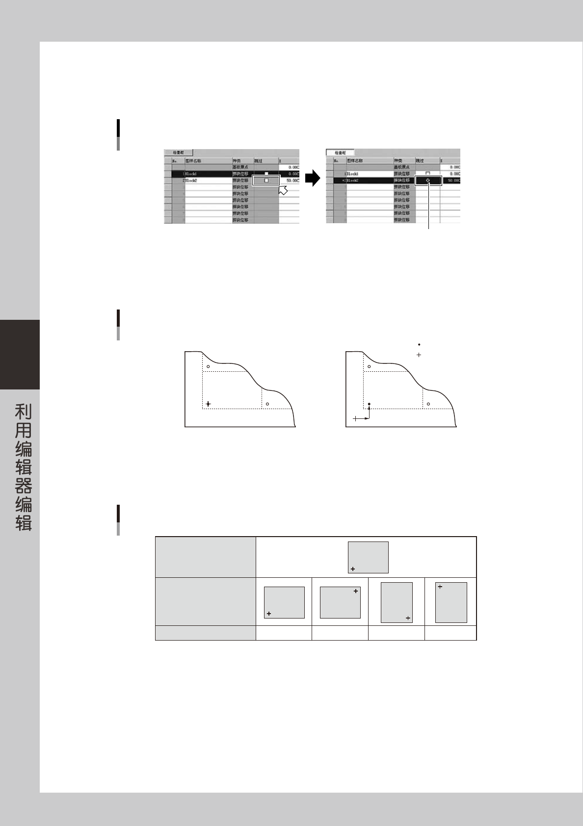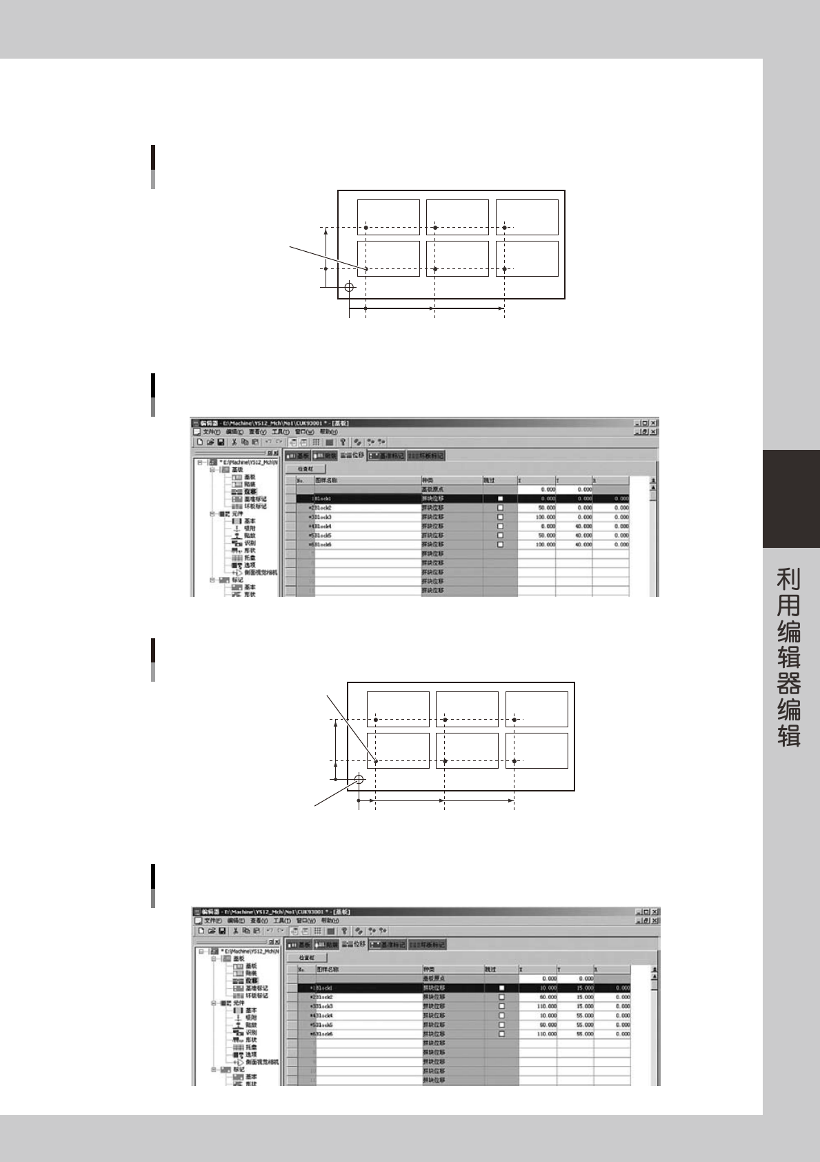 4-5 4 3 登录其他拼块的信息。 在第二行以后的行中,登录其他位移信息。 0 -5 0 -5 40 50 100 举例说明基板原点和基准拼块原点一致时的状态 基板原点 基准拼块原点 拼块1 拼块2 拼块3 拼块4 拼块5 拼块6 25503-P2-00 基板原点和基准拼块原点一致时的「位移」画面 26505-P2-00 10 0 15 55 60 110 拼块1 拼块2 拼块3 拼块4 拼块5 拼块6 举例说明基板原点和基准拼块原点…