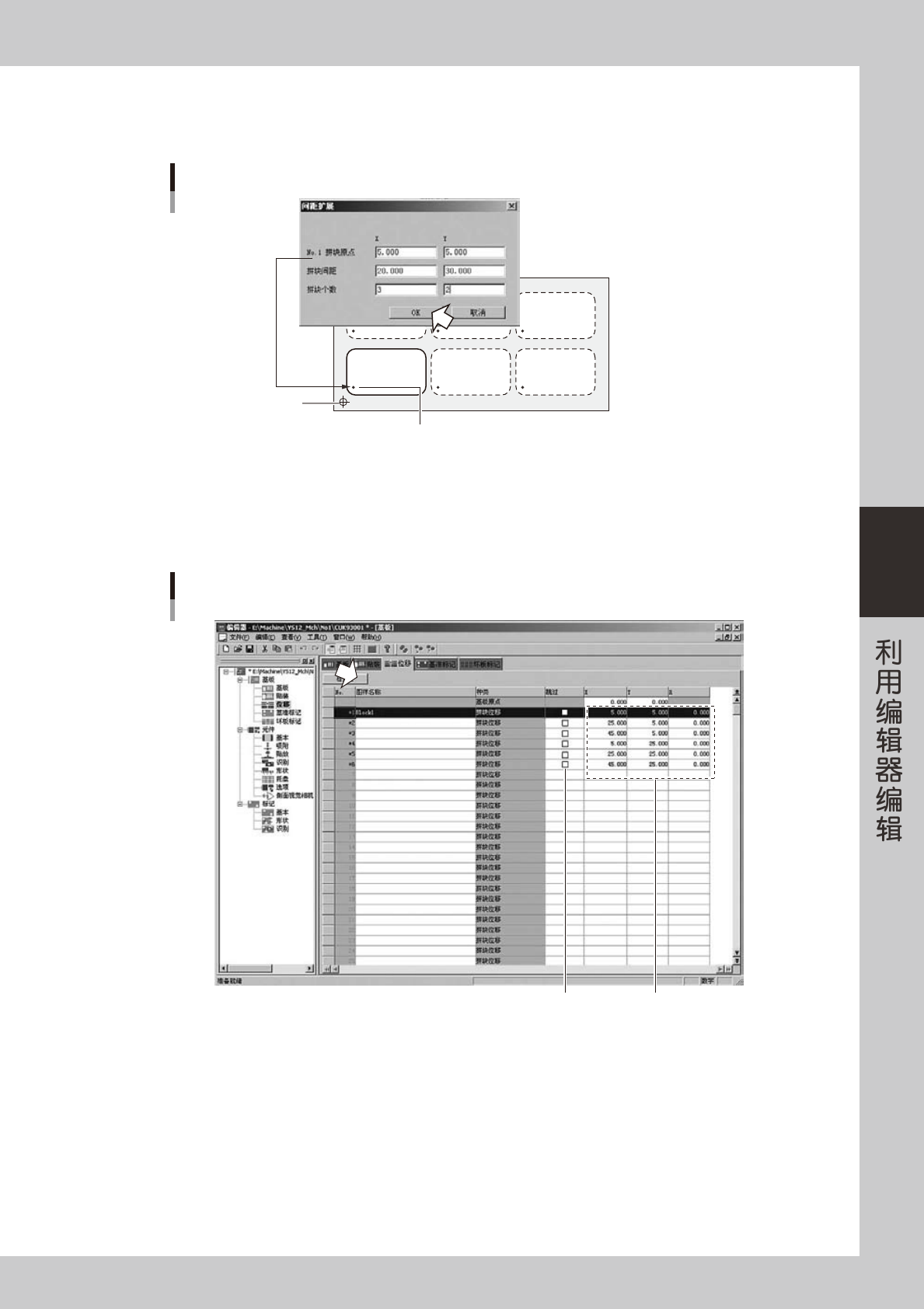 编辑贴装信息时,在拼块基板的状态下作业,而执行最优化和进行生产时,则通过扩展位移进行作业。