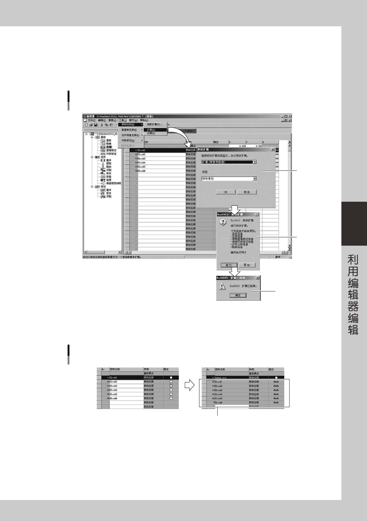 4-8 4 3.3 拼块位移的扩展·还原 扩展各拼块的数据,将其变换为整块基板的数据,或将已扩展的数据还原为原拼块的数据。将设置了位移的拼块 数据扩展为整块基板数据的功能,能提高生产效率。 编辑贴装信息时,在拼块基板的状态下作业,而执行最优化和进行生产时,则通过扩展位移进行作业。 3.3.1 拼块位移的扩展 扩展位移信息。 1 从「拼块位移」中选择「扩展」 。 从「工具栏 (T)」菜单的「拼块位移 (B)」中选择「扩展 (D)」 。 …