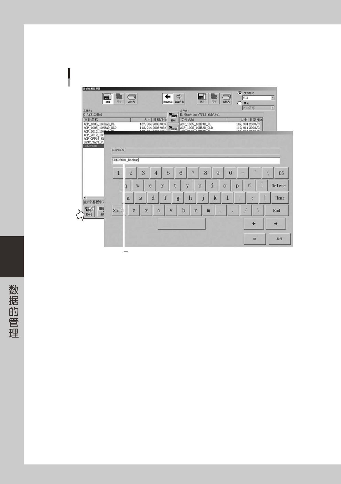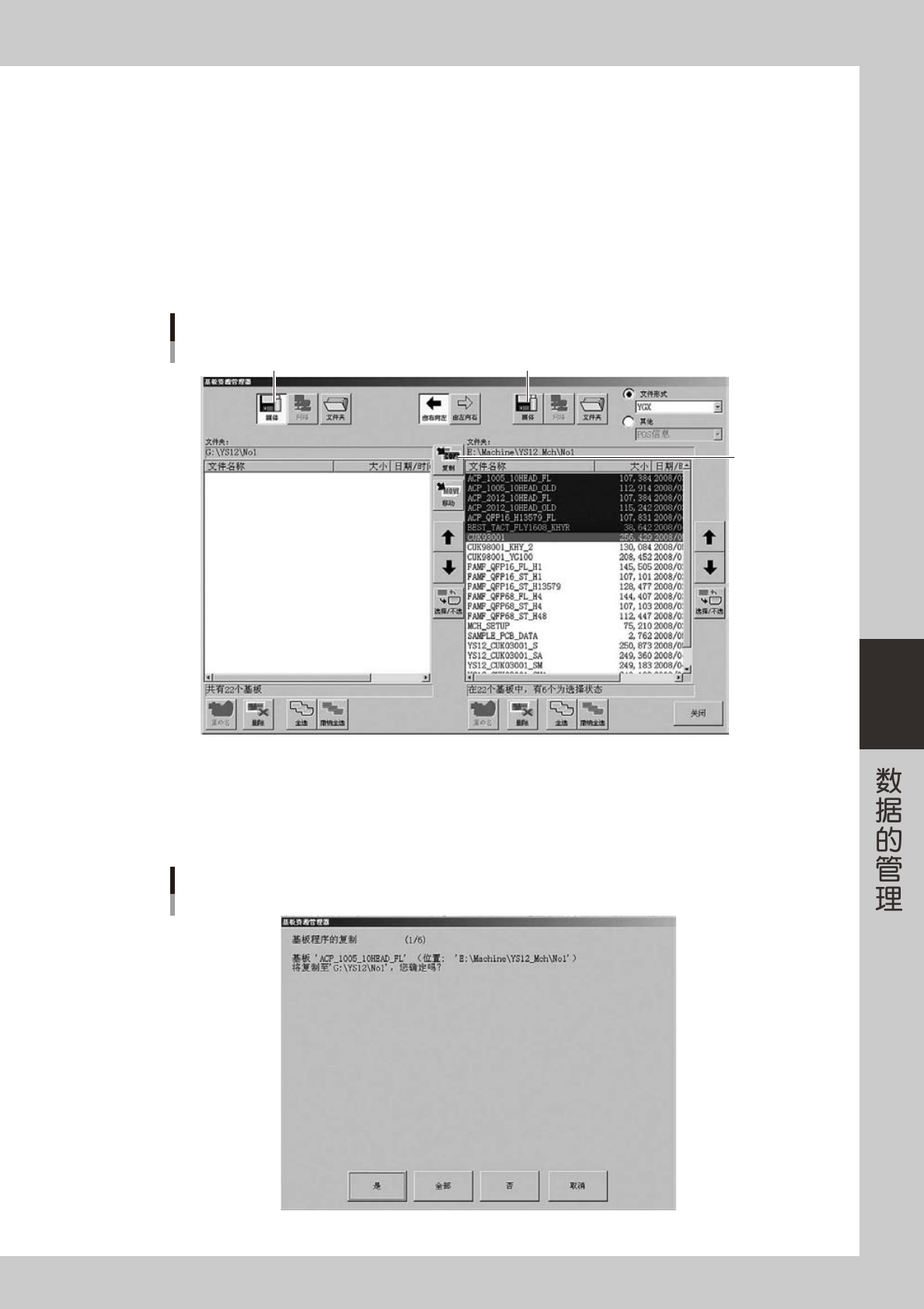 5-5 5 6 选择文件形式。 从下拉式菜单中选择。 7 选择要备份的基板程序。 用光标选择要备份的基板程序。按住 [Ctrl] 键或 [Shift] 键选择,可以选择多个程序。需选择全部基板 程序时,按 [ 全选 ] 按钮。 8 指定保存位置。 「由右向左」复制时,按左侧列表上的 [ 媒体 ] 键。 「由左向右」复制时,按右侧列表的 [ 媒体 ] 键。 由右向左复制 复制位置的选择 由左向右复制 复制按钮 26609-P2-00 9 …