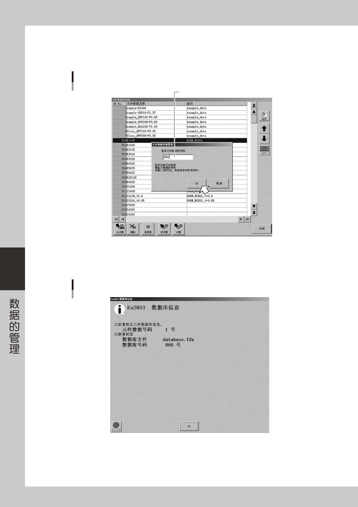 5-15 5 2.2 扩充元件数据库 一般元件数据库的最大登录数在 3000 左右。通过扩充作业最多可以登录 16000。但是,进行扩充作业时必须 注意以下几点。 · 数据库最大登录元件数包括了 YAMAHA 领域的元件数据,并不是客户实际可以使用的元件数。 · 通过数据库匹配的自动登录无法进行数据库的扩充作业。如果要在扩充领域进行自动登录,必须先进行新登录 并实施数据库的扩充,再执行数据库匹配作业。 ■使用方法 1. 通过在数据库…