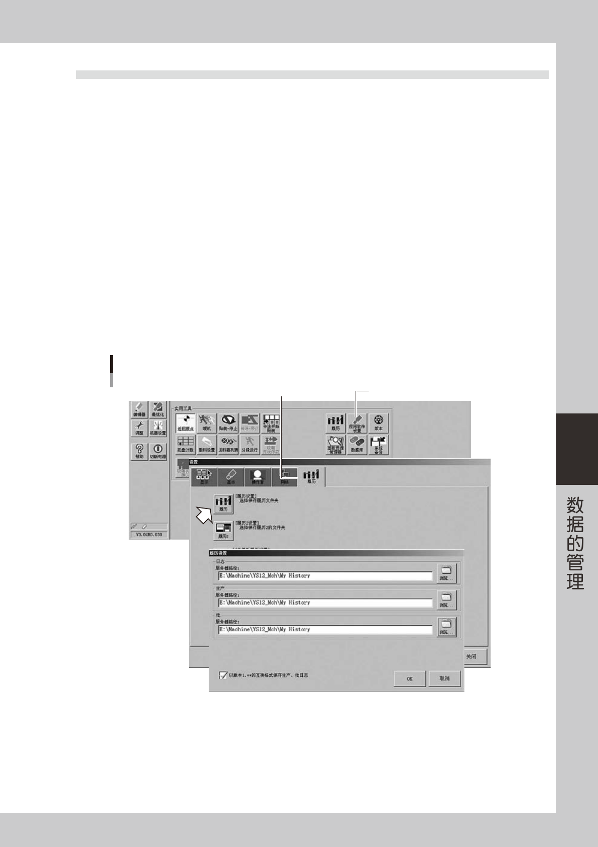 5-29 5 3.4 履历数据的编辑 3.4.1 设置自动保存位置 可以设置结束主机的操作时生产履历自动保存至指定的位置。 1 按 [ 应用软件设置 ] 按钮。 显示「设置」画面后,打开「履历」选项卡。 2 按[履 历]或[履 历2 ]按 钮 。 ‧ 设置「履历」项目的保存位置时,按 [ 履历 ] 按钮。 显示「履历设置」画面。 ‧ 设置「履历 2」项目的保存位置时,按 [ 履历 2] 按钮。 显示「履历设置 2」画面。 3 指定服务…