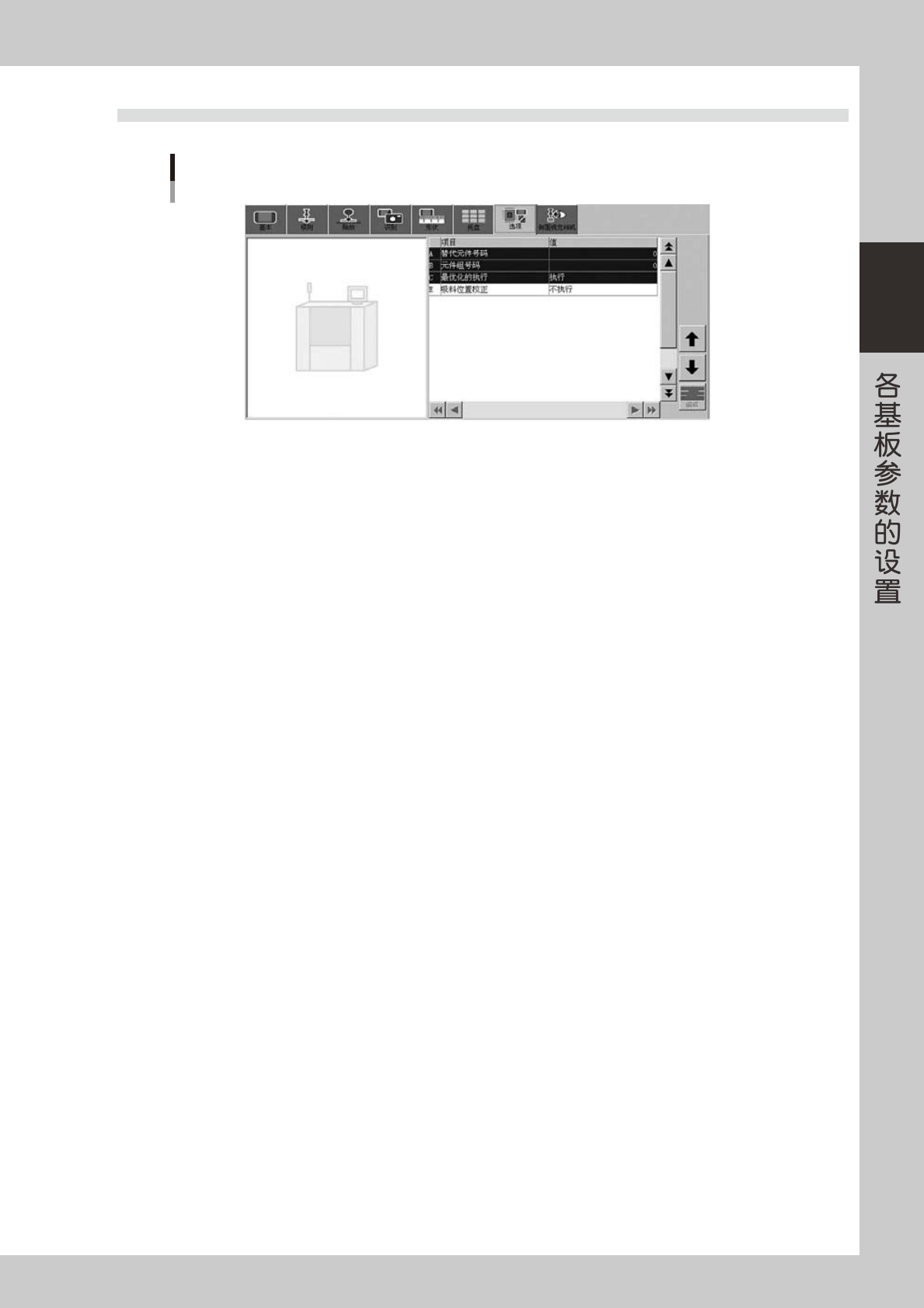 2-32 2 4.8 侧面视觉相机参数 该参数只有在配备了侧面视觉相机 ( 选配装置 ) 的情况下才会显示。 侧面视觉相机参数 26217-P2-10 A: 侧面视觉相机的识别 设置侧面视觉相机的识别方法。从下拉菜单中选择。 「没有」 不使用侧面视觉相机功能。 「有简易」 用简易方式执行侧面视觉相机的识别。 将「形状」选项卡画面的「C. 外形尺寸元件厚度 (mm)」设置的数值为基准值, 以 ±50% 以内的元件厚度误差为…