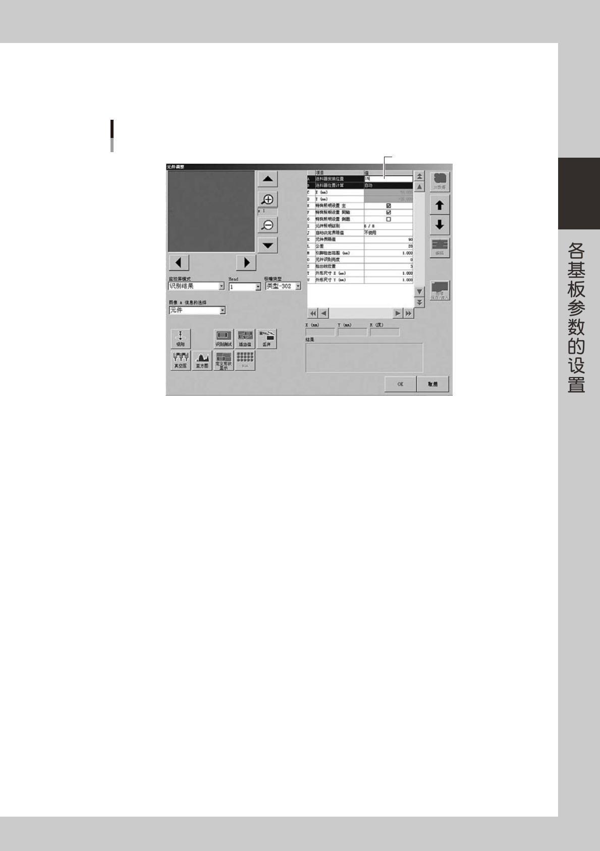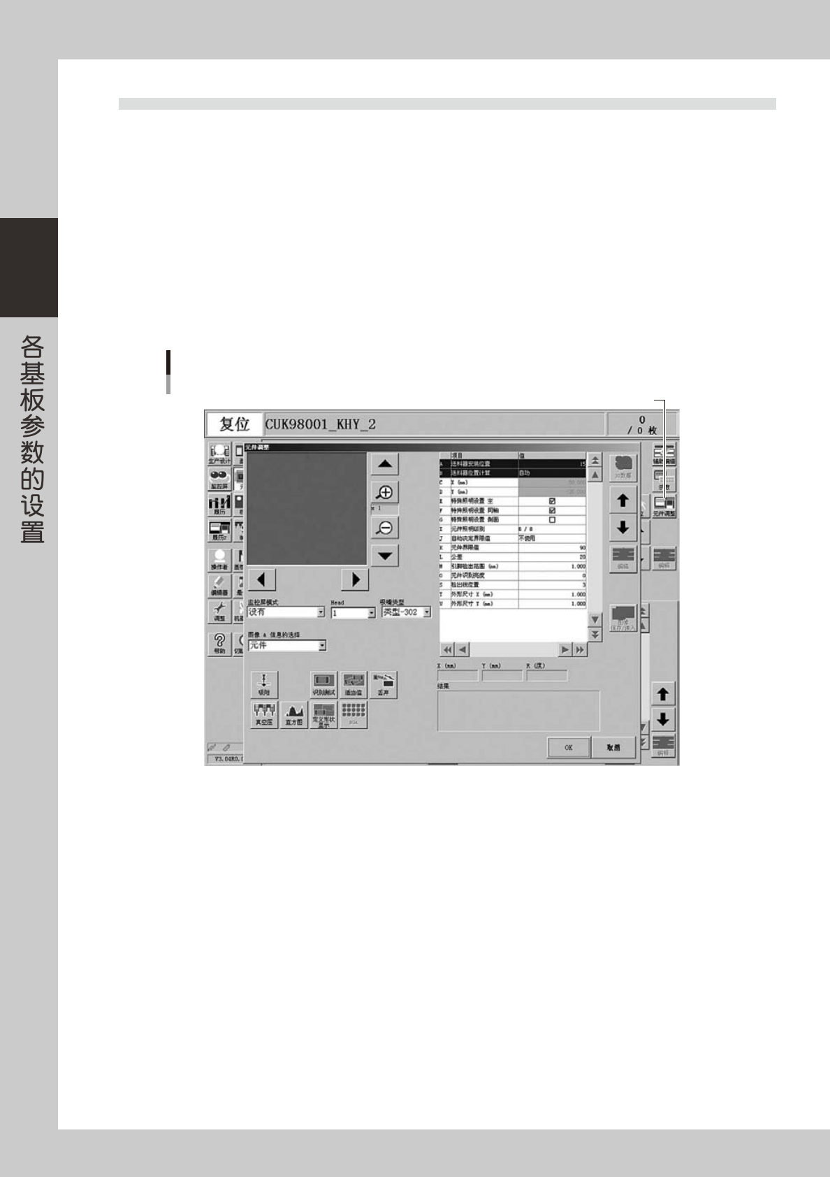 2-35 2 4 设置送料器的安装位置。 该项目只对送料器安装位置未定的元件进行设置。将光标移至元件调整项目的「送料器安装位置」 ,输入 安装送料器的送料器架的号码。 设置送料器安装位置 送料器位置输入画面 26219-P2-00 5 确认使用的贴装头和吸嘴。 显示使用的贴装头号码和吸嘴的类型。如需变更贴装头号码,从「Head」栏中选择。如需变更吸嘴类型, 则需返回「基本」参数画面,更改基本参数的「使用吸嘴」 。 6 执行元件的吸附。 …