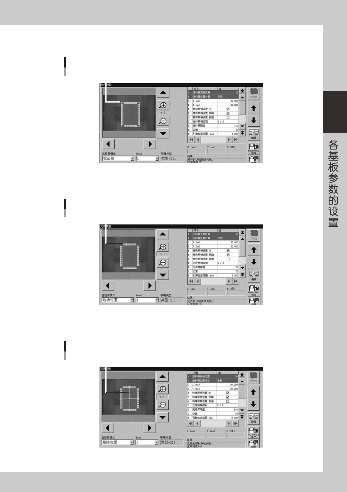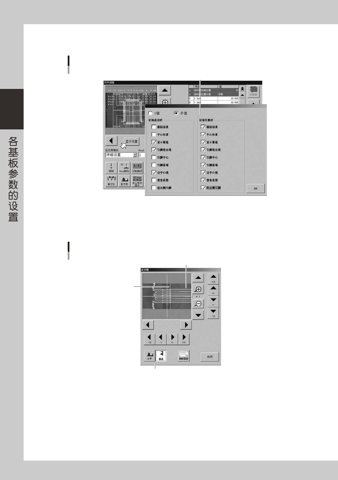 2-40 2 · 详细设置 按[显示设置]按钮,显示对话框,选择需要显示的内容。可以分别选择识别成功时与识别错误时的显示内容。 监控屏模式「详细设置」 选中需要显示的内容前的选择框 26260-P2-00 ■确认检出引脚所需要的亮度差(直方图) 可确认引脚部分比背景亮多少。按[水平]或[垂直]按钮后,除十字光标外会另外显示红色光标,使用方向键将其移至 引脚之上。引脚的亮度差通过蓝色线显示,由此可以确认对比状态。 直方图 垂直显…