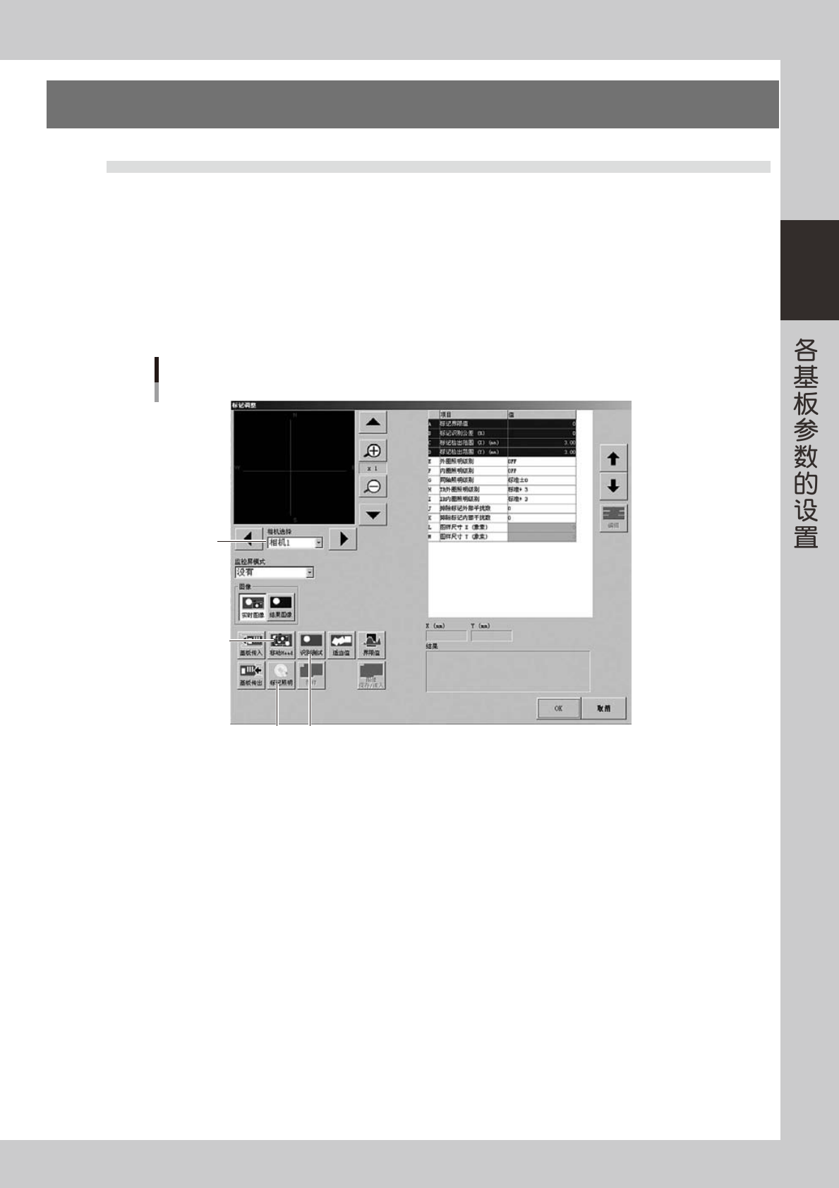 2-49 2 5. 标记识别测试 5.1 执行标记调整 标记调整是确认已设置的参数是否适当的作业。未设置的参数则通过识别测试获取最佳值。在此,以基本参数的 「标记功能」设置为「基准标记」时的调整方法为例进行说明。 1 选择标记数据。 打开标记画面,将光标移至需进行确认作业的数据 No. 行。 2 打开标记调整画面。 按 [ 标记调整 ] 按钮,打开如下图所示画面。 Step 5 Step 4 Step 6 标记调整 选择相机 26…