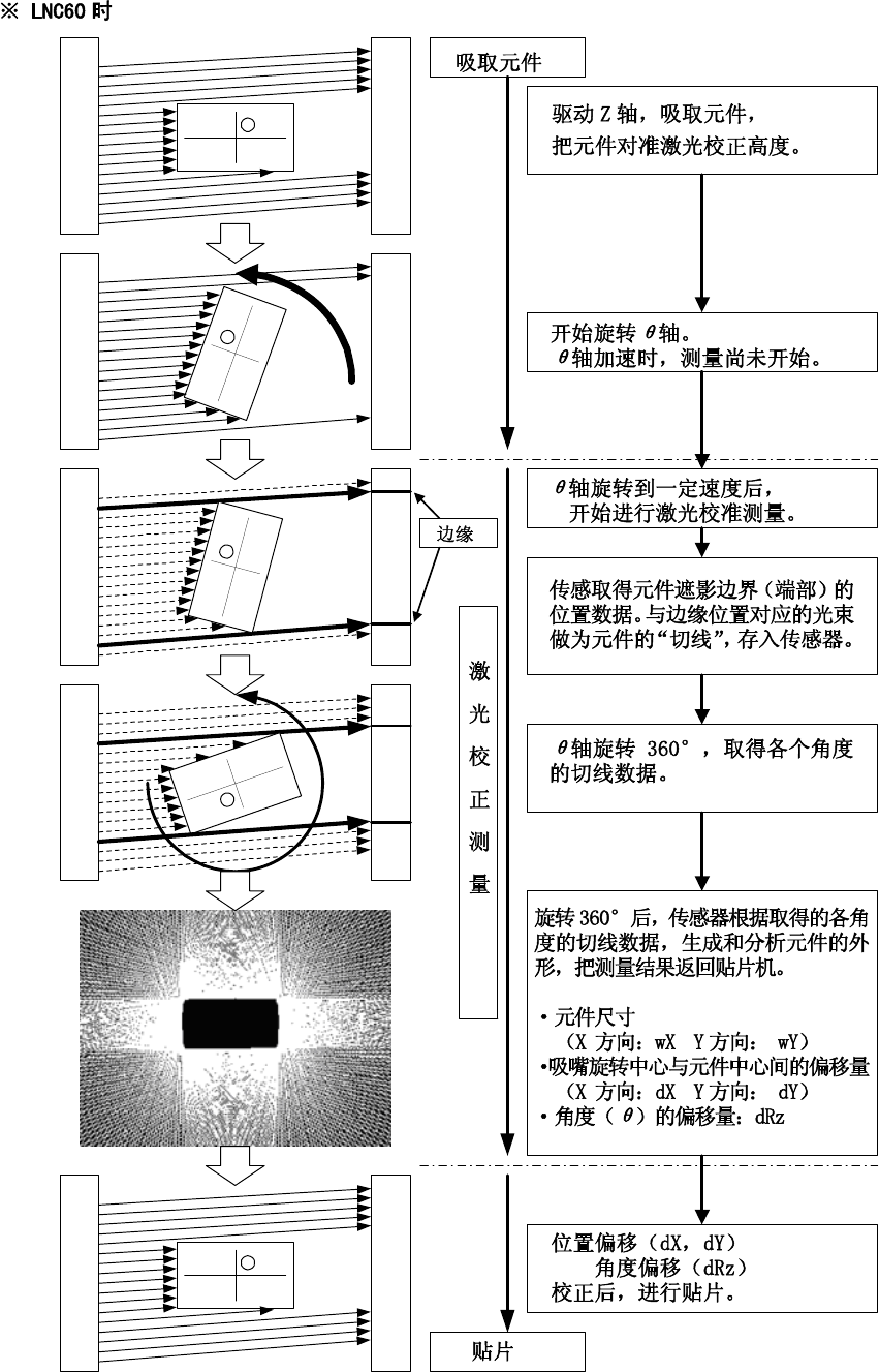 根据吸取姿势按贴片角度转动并贴片。 用于激光定中心不稳定的元件