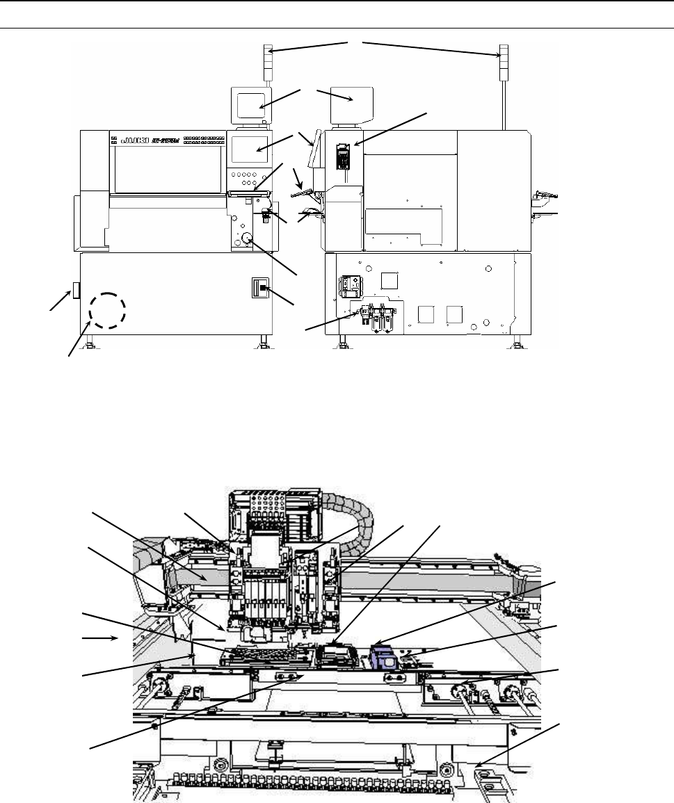 操作手册Ⅱ 1-5 1-3-4KE-2080R 系统构成 紧急停止按钮 UPS( 不间断电源装置 ) 外体 漏电断路器 *1 电源装置 CPU 板 I/O 控 制装置 马达控制装置 X-Y 定位装置 贴片头 图像识别装置 对应 12 mm 元 件 (N…