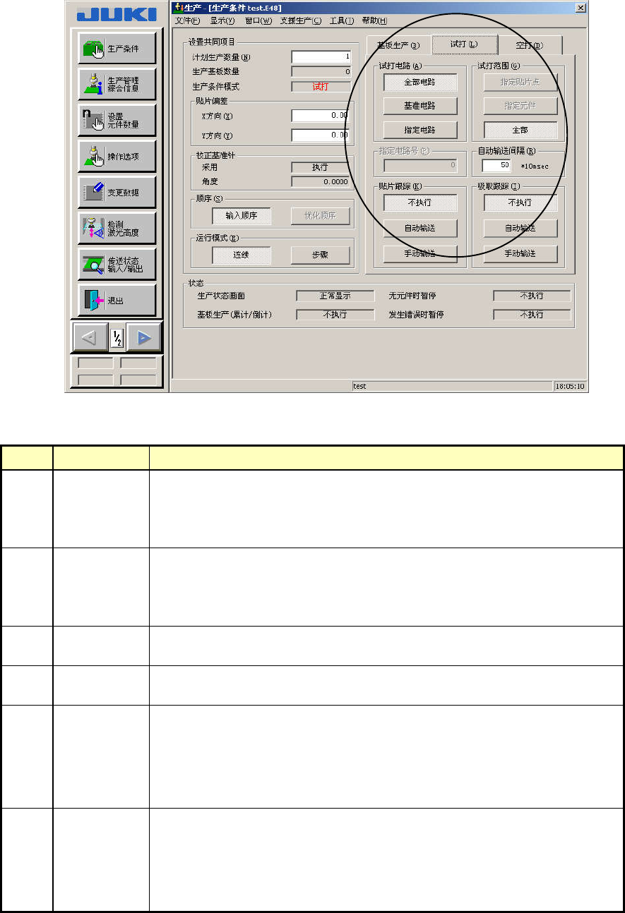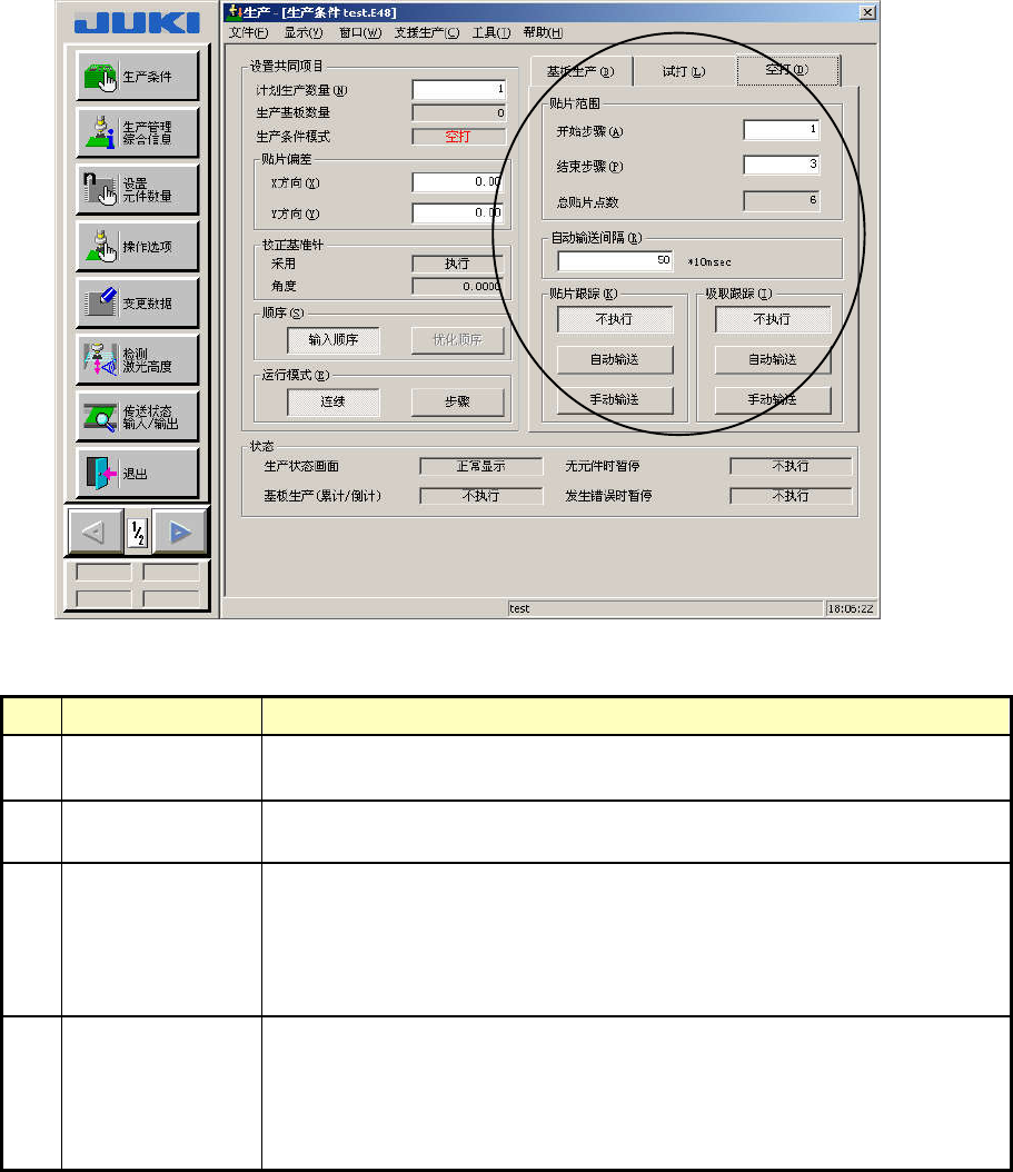 操作手册 II 3-7 3) 空打 No. 项目 内容□ 1 贴片范围 (步骤号) 需限定贴片范围时,请输入开始步骤号和结束步骤号。在总贴片点数项 中显示每 1 电路中的总贴片步骤号。仅在设定为输入顺序时适用。 2 自 动输送…