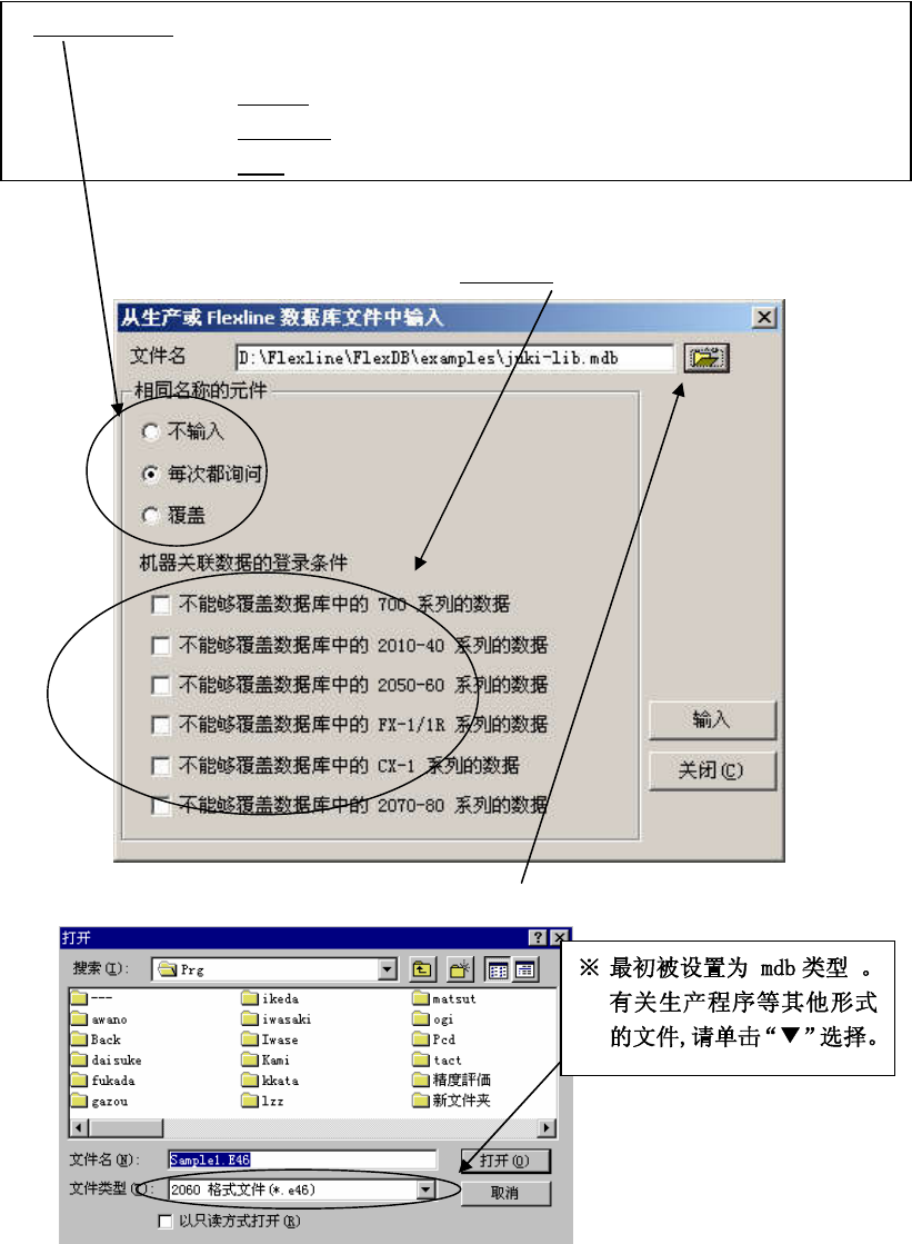 操作手册Ⅱ 4-11 (3)注册(在数据库中的注册) 对生产程序或其它数据库中所注册的所有元件数据进行统一注册。 <步骤> 1) 在菜单栏中,单击“数据”/“注册 ” 。 2) 显示如下画面。设置选择文件和注册时的条件。 ① 指 定注册条件。 ※“注册条件”∶ 对统一注册 时如若数据库中已有注册的同名元件时,是要 进行覆盖 注册、还是不注册进行设置。 ●不注册∶不覆盖同名元件。 ●每次询…