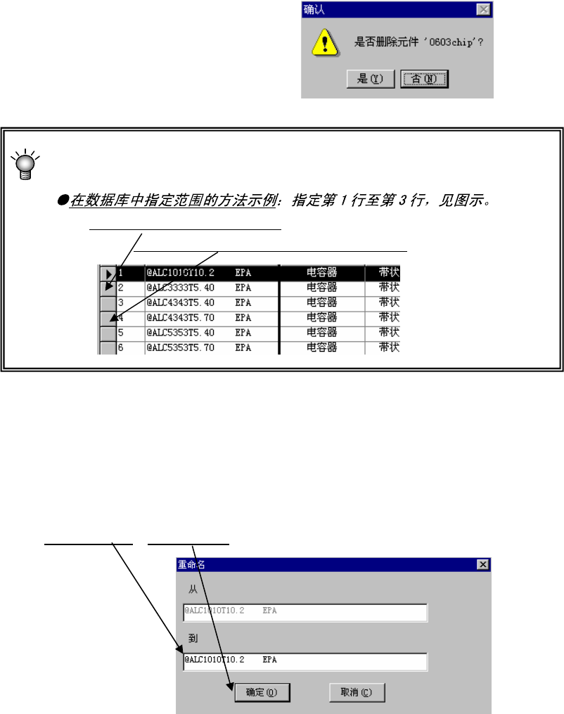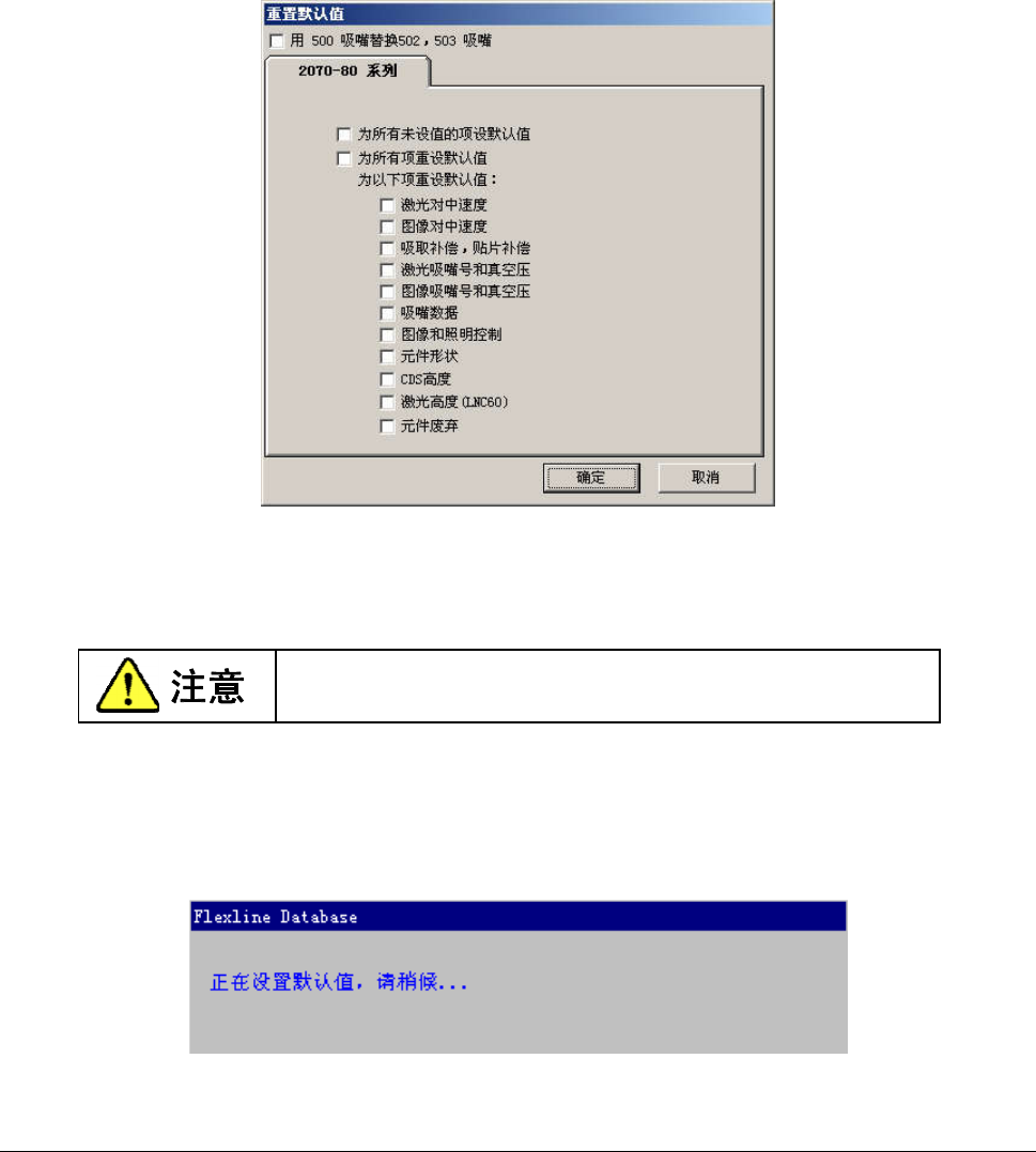操作手册Ⅱ 4-14 (7)替换 在显示元件清单或元件表格时,从菜单栏中选择“数据”/“替换”后,显示如下画面。 ● 将 50 2,503 号吸嘴替换为 500 号吸嘴 已设置为激光定心和图像定心的502号吸嘴和503号吸嘴,全部被换为500号吸嘴。 一旦替换为 50 0 号吸嘴,即无法恢复数据。 ● 标签内的选项 将选择的项目重新设置为默认值。 重新设置数据时,画面上显示如下信息。 …