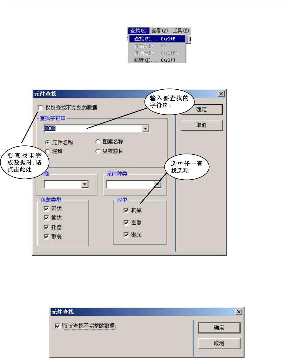 4) 查找未完成的元件数据时,请单击“仅仅查找不完整的数据”。显示如下画面后,请单击“确