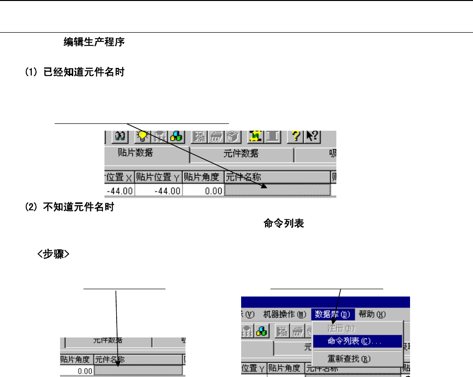 操作手册Ⅱ 4-26 4-1-2IS数据库 4-1-2-1IS元件数据库的使用方法 在“ ”中 ,可运用数据库来制作元件数据。 元件名已被注册到数据库时, 只要在“贴片数据” 中输入元件名, 数据库的内容即被注册到正在 制作的生产程序中。 在此输入元件名,即可完成元件数据。 显示数据库列表,从列表中选择要注册的元件。( 功能) ①请单击空白的元件名称栏。 ②请单击“数据库”/“命令…