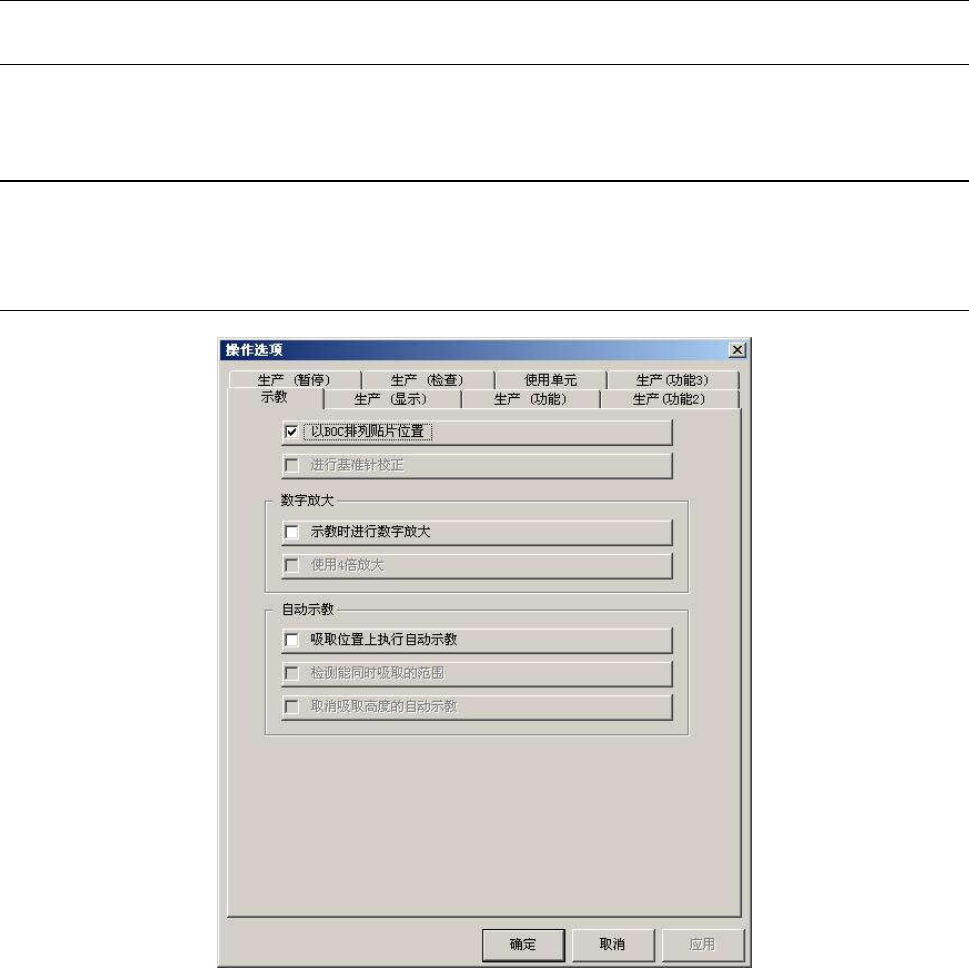 操作手册Ⅱ 4-33 4-2操作选项 4-2-1概要 对制作程序、或生产时的动作条件等进行设置。 操作选项中可设置的项目列表如下。 4-2-2详细设置项目 从主画面的菜单栏中选择[选项]/[操作选项],显示操作选项的设置画面。 操作选项由7项构成,点击画面上方的标签可切换各项目。 4-2-2-1示教