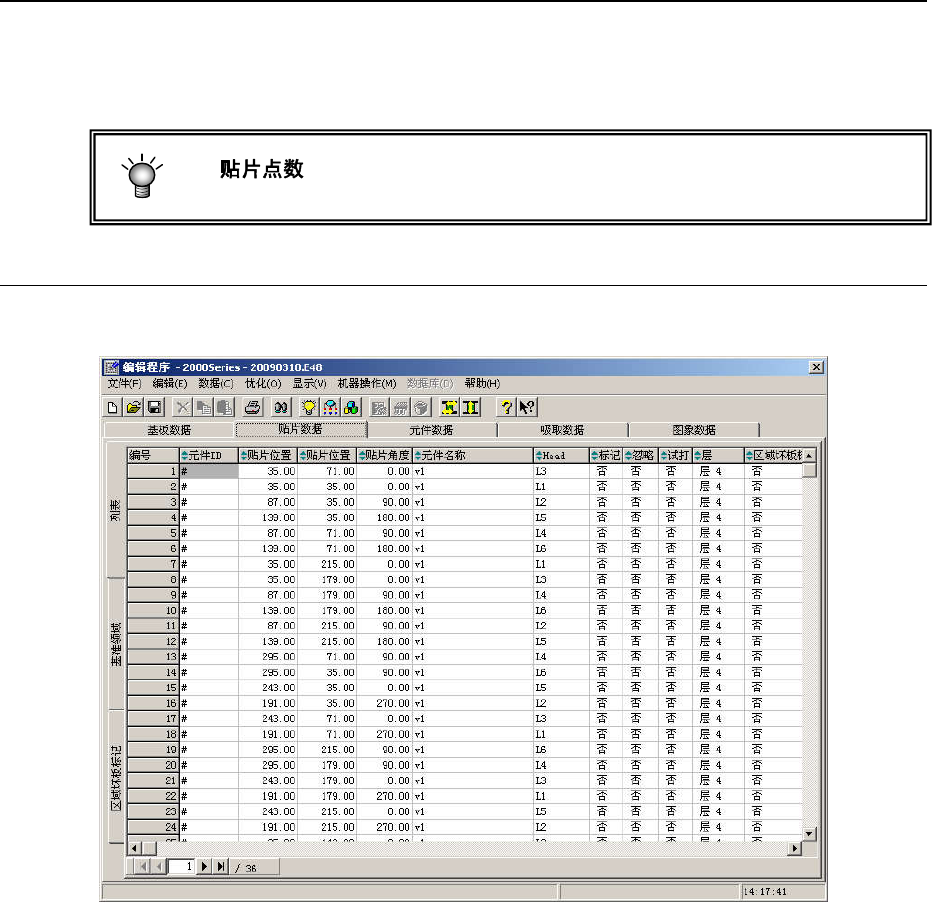 操作手册Ⅱ 2-27 2-3-4贴片数据 输入与贴片元件的贴片坐标有关的信息。 多电路板时,输入有关“基准电路”的信息。 最多为 3,000 点 ,分割基板时最多可输入 10 ,000 点。 2-3-4-1贴片数据画面的显示…