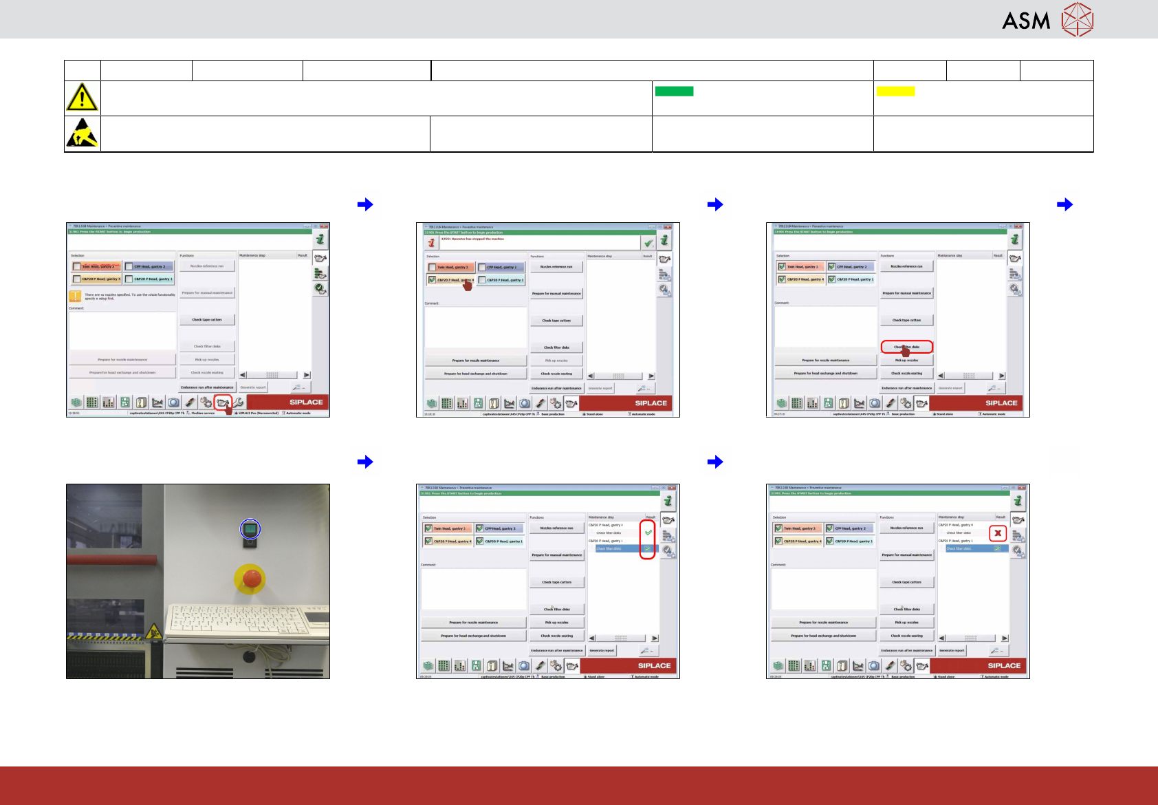 1 Click on "Pick up nozzles". 2 Click on "Check nozzle seating". 3 Check if the result is OK (green hook).