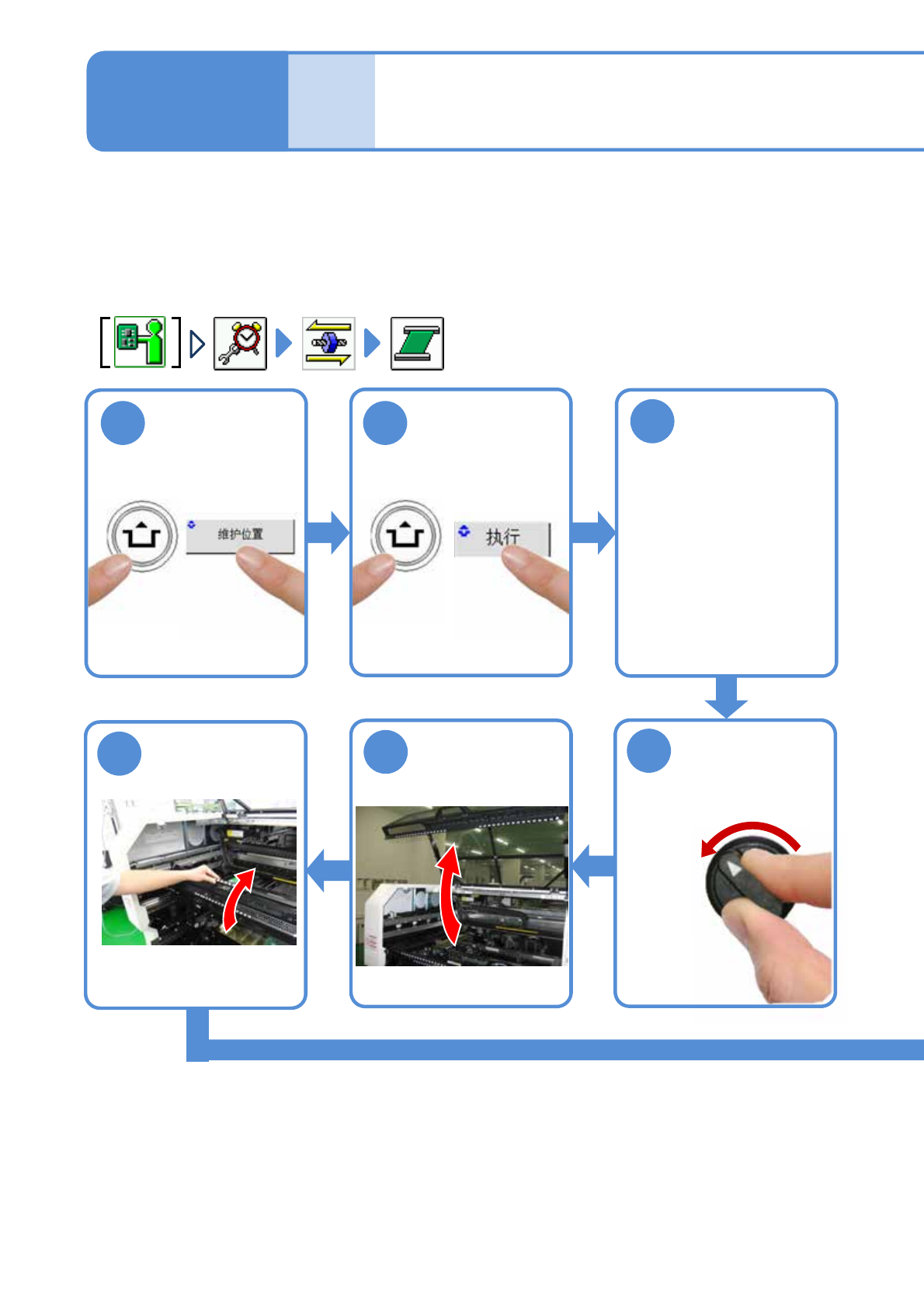 EJM9DC-MB-04E-0 0 NPM-W X/WXS 卸下托盘供料器或 者交换台车 工程师手册 4-1 基板传送带的润滑脂添加 1 4-1 -1 1 5 2 3 4 6 OFF SERVO ON 将供料器工作台盖 倒向内侧 ( → P.2-5) ●事先确认不存在支撑销。 确认提示 ●不要倚靠在供料器工作台盖 上,也不要在上面放置物品。 ●托盘供料器时 ( → P.11-8) ●交换台车时 ( → P.2-4) ACTIV A TI…