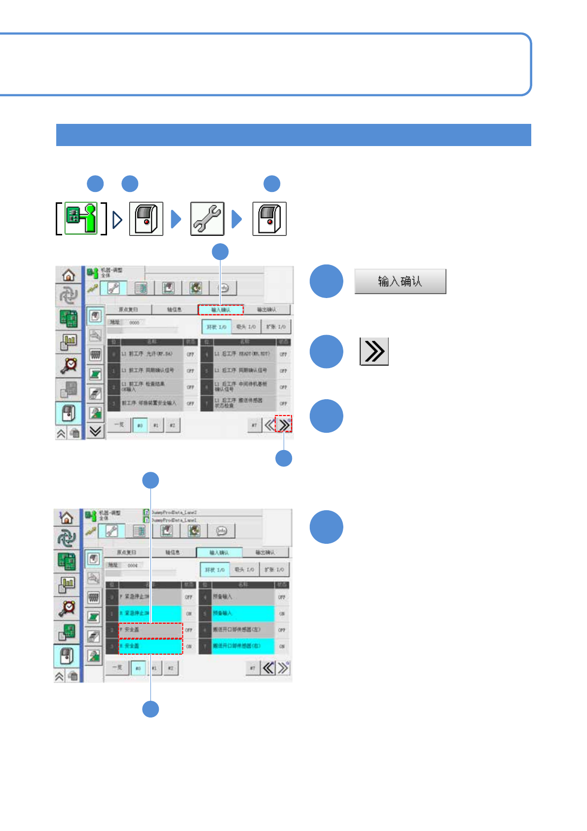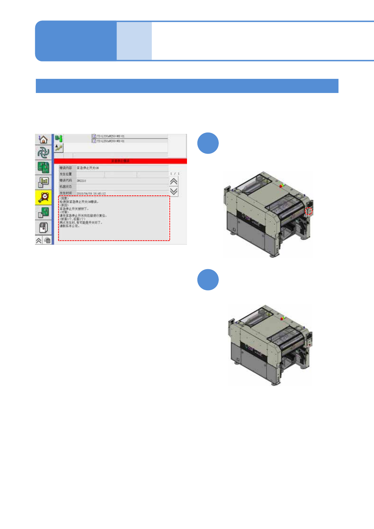 EJM9DC-MB-04E-0 0 NPM-W X/WXS 安全开关的检查 1 按后侧的紧急停止开关,并确认画 面与前侧相同地过渡到新画面。 4-9 -1 工程师手册 4-9 紧急停止开关的检查 2 对紧急停止开关的检查方法进行说明 。 使用工具 : 不要 所需时间 : 2 分钟 ●请事先执行原点复归操作。 按前侧的紧急停止开关。 请确认画面已经过渡到左侧画面。