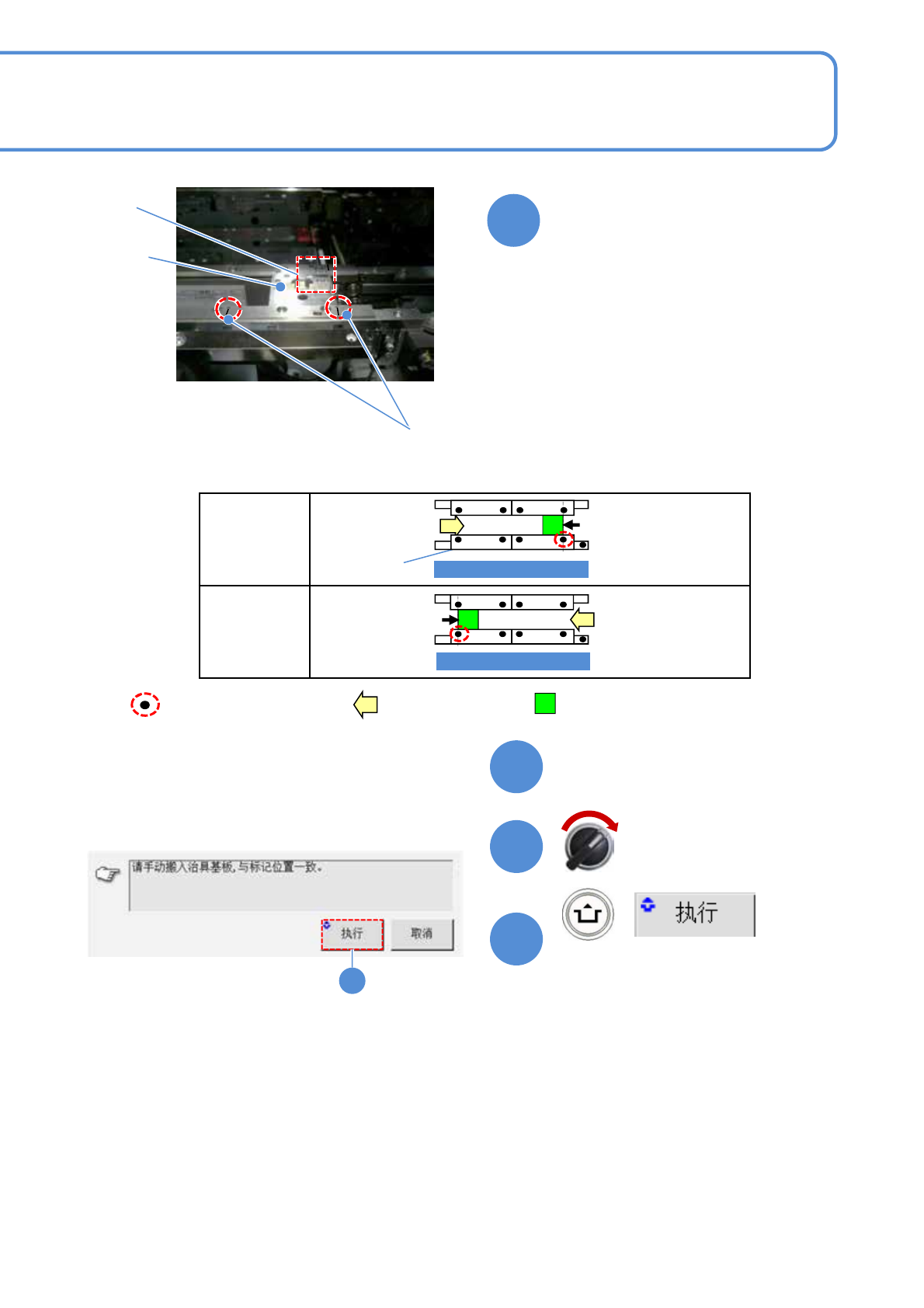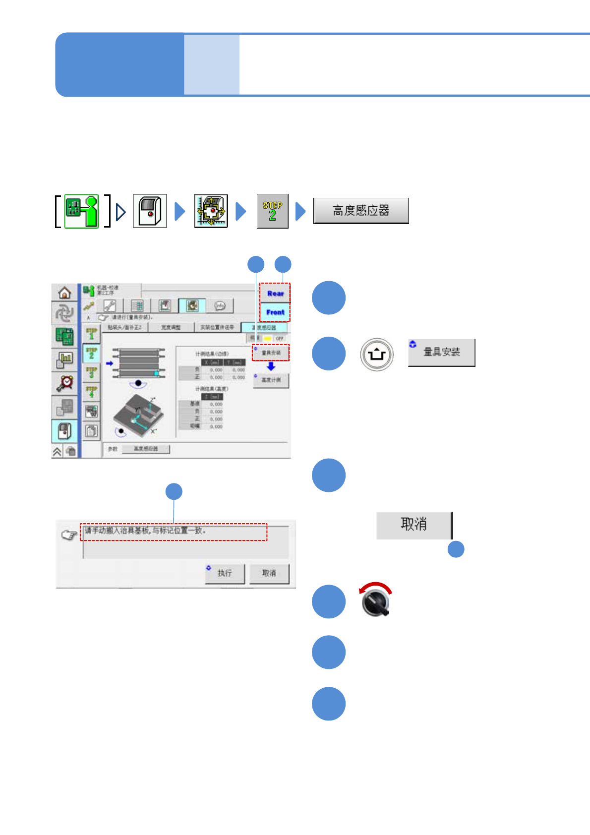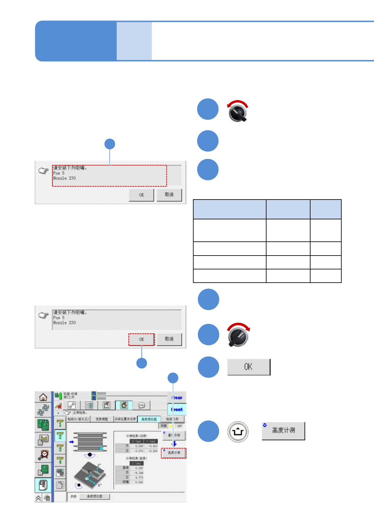 EJM9DC-MB-10E-0 0 NPM-W X/WXS 10 10-7 -2 + 7 关闭安全盖 伺服开关置于 ON 8 9 : 基板的输送方向 : 高度传感器治具 左 → 右输送 右 → 左输送 : 基准标记传送带侧 对准的位置标记 ( 2 孔 ) 基准轨道 OPERATOR SIDE OPERATOR SIDE 高度传感器治具 从待机侧滑动高度传感器治具进 行设置 传送带侧 对准的位置标记 x4 处 测量部 ( 贴装头移动到…