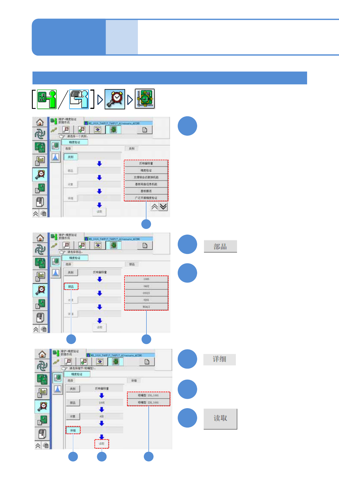 EJM9DC-MB-10E-0 0 NPM-W X/WXS 10-15-2 -1 2 1 生产准备 1 (MCDATA: 精度验证程序的读入 ) 选择要实施的项目 3 选择要实施的元件 5 4 6 选择要使用的吸嘴 1 3 5 2 4 6 精度验证 工程师手册 10-15-2 详细工序 1 ( 贴装头 )