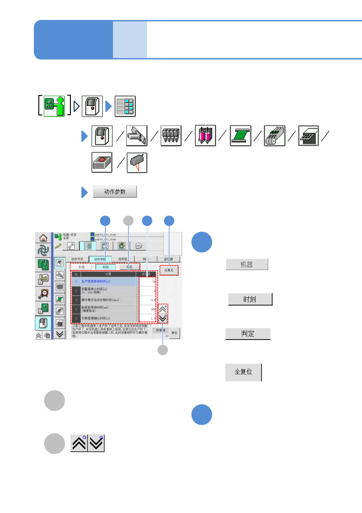 EJM9DC-MB-13E-0 0 NPM-W X/WXS 单元设定 B 1 1 2 A 动作参数的设定 1 13-1-2 -1 A B 工程师手册 13-1-2 1 2 设定系统动作的参数。 选择动作参数的种类 ■设定尺寸时 ■设定时间时 ■判定时 ■设定为本公司的标准规格时 ( 被初始化 ) 动作参数的设定状态 显示前后画面。 修改画面上需要修改的数据 ●轻触画面,显示输入画面。