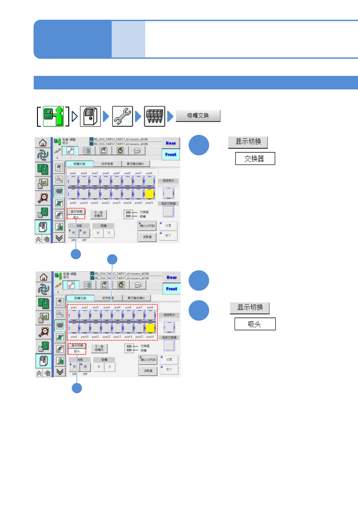 EJM9DC-MB-13E-0 0 NPM-W X/WXS 单元调整 贴装头的吸嘴更换 2 13-2-5 -3 工程师手册 13-2-5 1 2 3 1 2 3 选择 把吸嘴交换器内的吸嘴安装在贴装头 。 在 在 选择 ( 按钮变成蓝色 ) 选择需要安装的吸嘴 吸嘴的安装