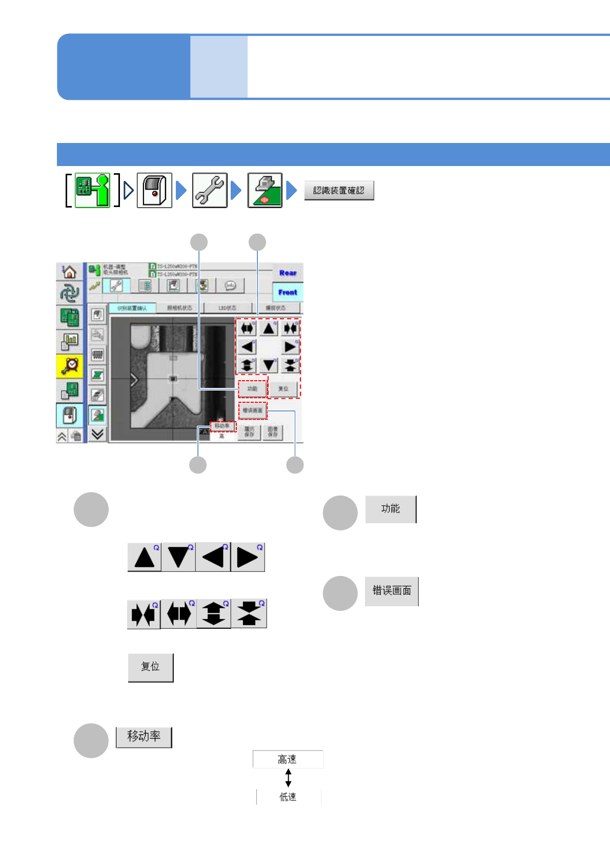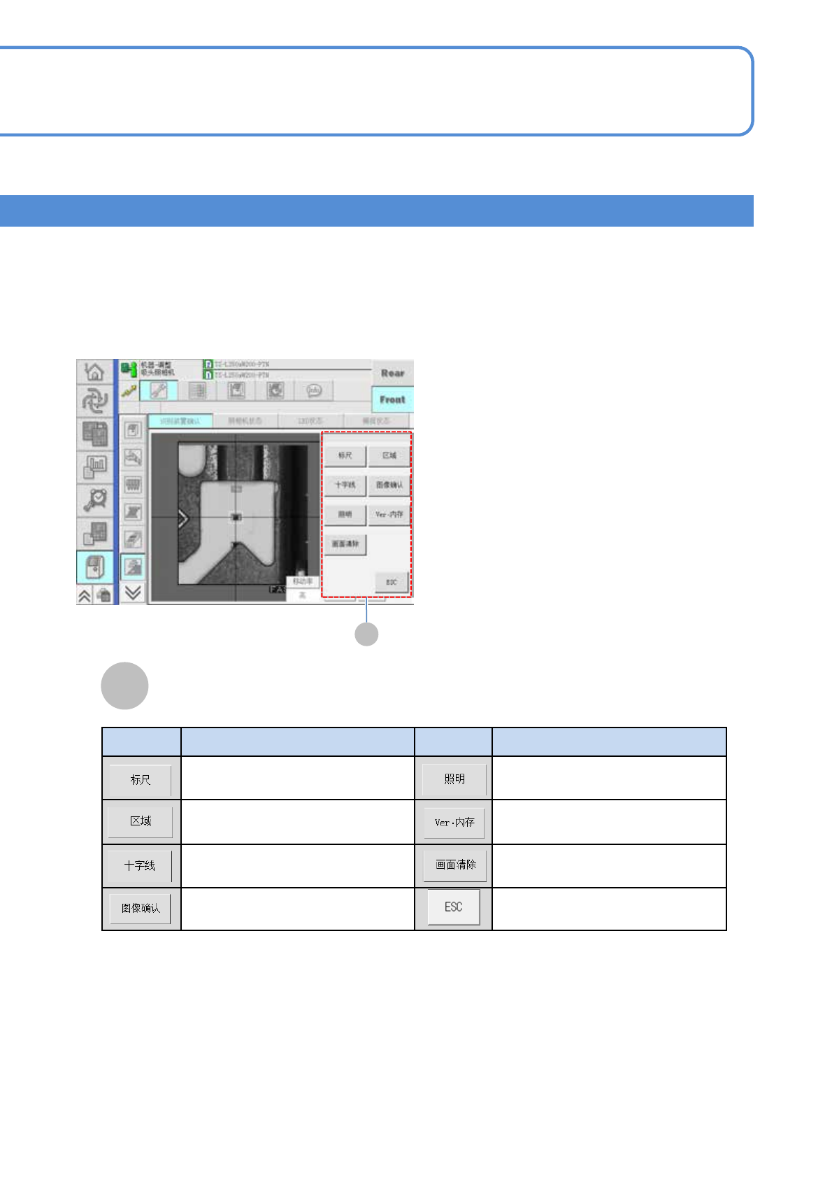 EJM9DC-MB-13E-0 0 NPM-W X/WXS 操作键 功能 操作键 功能 在画面上显示同心圆的标尺。 可以调整亮度。※ 在画面上显示四角框。※ 显示识别系统的版本。 在画面上显示十字线。 清除正显示的图像。 显示亮度选择画面。 返回原来画面。 13-2-9 -2 E E ※ NPM-WXS 仅可选择 Front 侧的 [ 照明 ] 和 [ 区域 ] 。 画面显示功能 ■「功能」画面