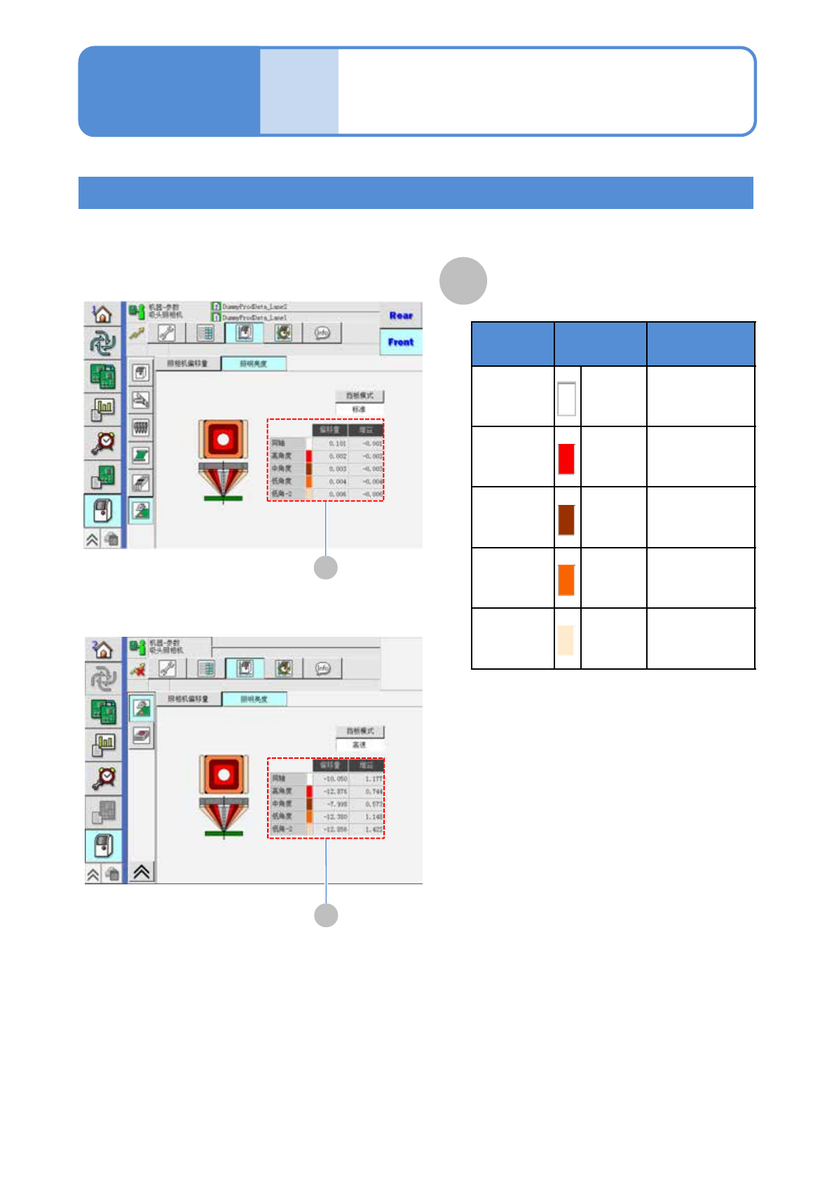 EJM9DC-MB-13E-0 0 NPM-W X/WXS 13-3-12 -2 确认照明亮度 A 照明 种类 颜色 说明 同轴 照明 白色 同轴照明 ・ 亮度偏移值 ・ 亮度增益值 高角度 照明 红色 高角度照明 ・ 亮度偏移值 ・ 亮度增益值 中角度 照明 褐色 中角度照明 ・ 亮度偏移值 ・ 亮度增益值 低角度 照明 橙色 低角度照明 ・ 亮度偏移值 ・ 亮度增益值 照明的亮度偏移值和亮度增益值 贴装头照相机照明 ( 标准 ) A