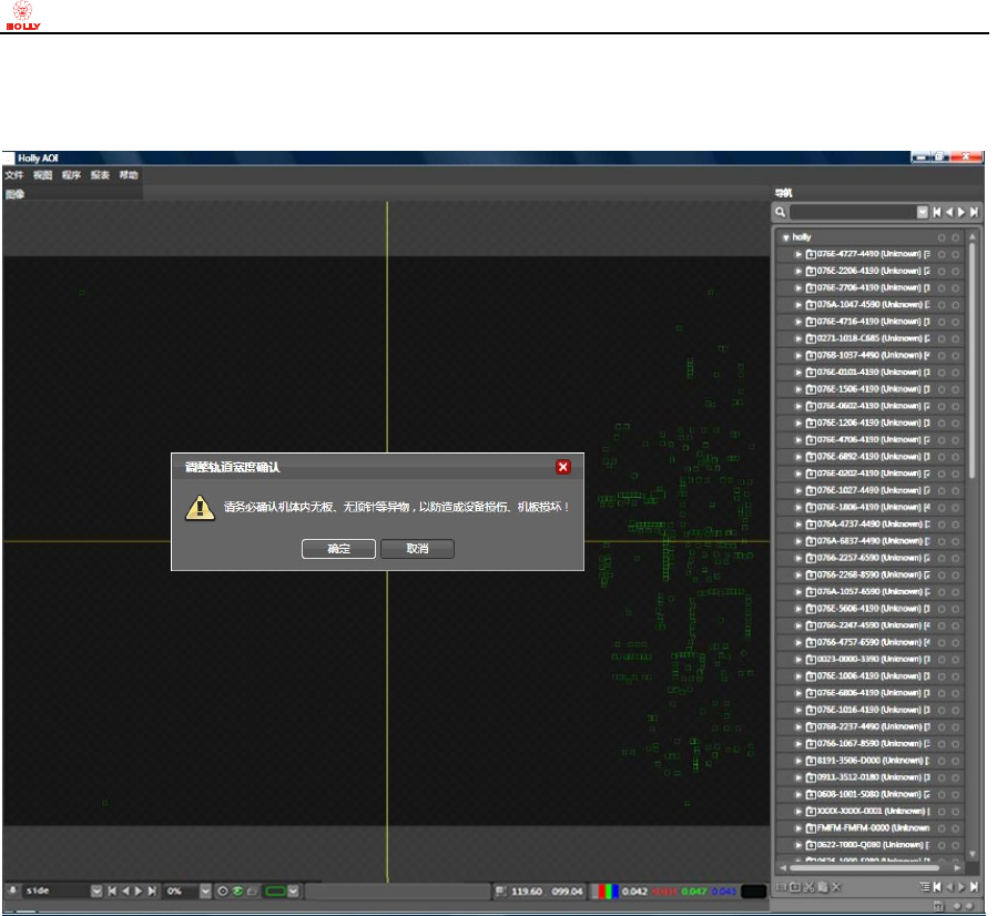 上海 赫 立 电 子 科 技 有 限 公司 在 线 型 自 动 光 学 检 测 仪 使 用 手册 第 1 8 页 共 6 4 页 屏幕 出 现 如 下 图 所 示 的 C AD 总 体 布 局 图 ( 绿 色 矩 形 框 显示 )及 元件 目 录 树 , 并 且 系 统 会 自 动出 现 “ 调 整 轨 道 宽 度 确认 ” 对 话框 , 点击 “ 确 定 ” 则 系 统 会 按照 先 前 设 定 的 “ 拍 照 / 轨 道 宽 度 ”…