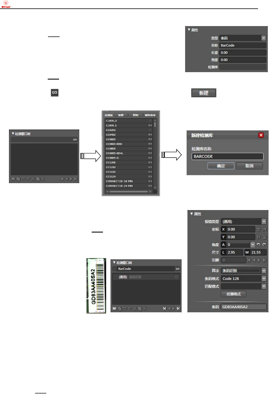 目录,“赫立 AOI 系统软件”将切换成检测库编辑界面,在“检测窗口树”板块点击右侧的“检测库新