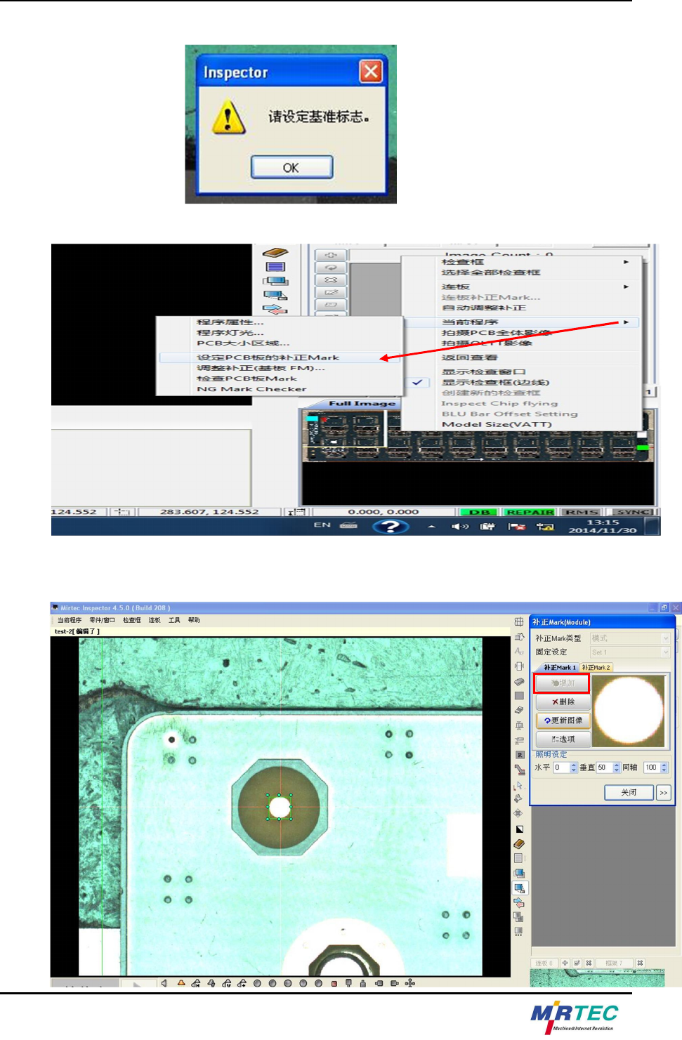 点击“增加(红框表示)”后,选择PCB板上的mark点,如图所示方法和mark点边缘相切取向,然后点击更新图像对
