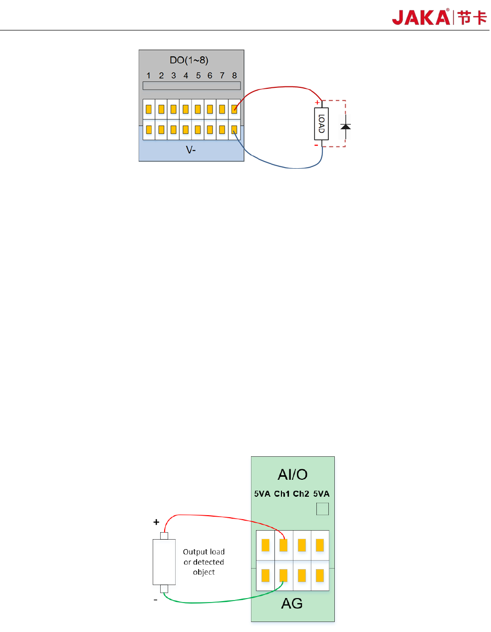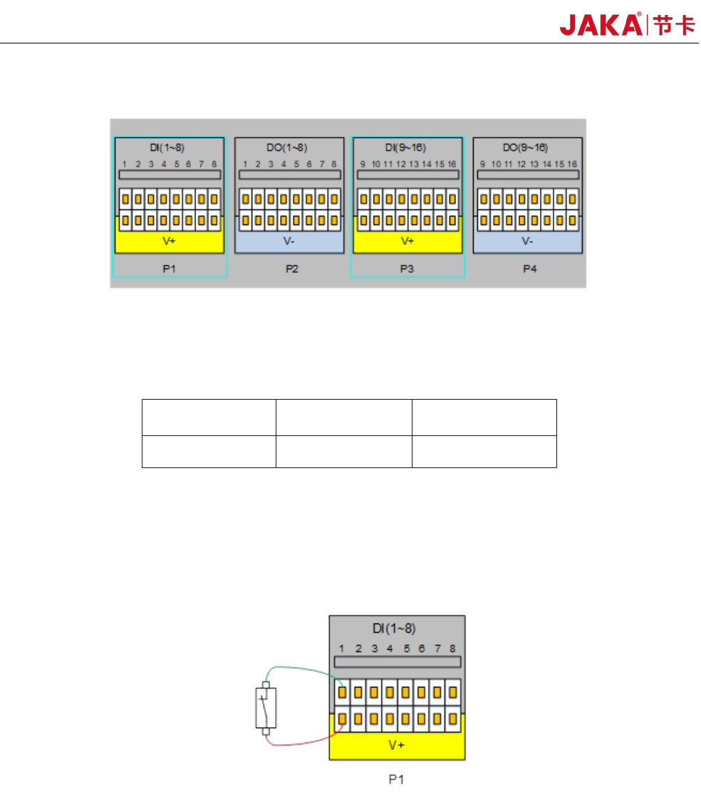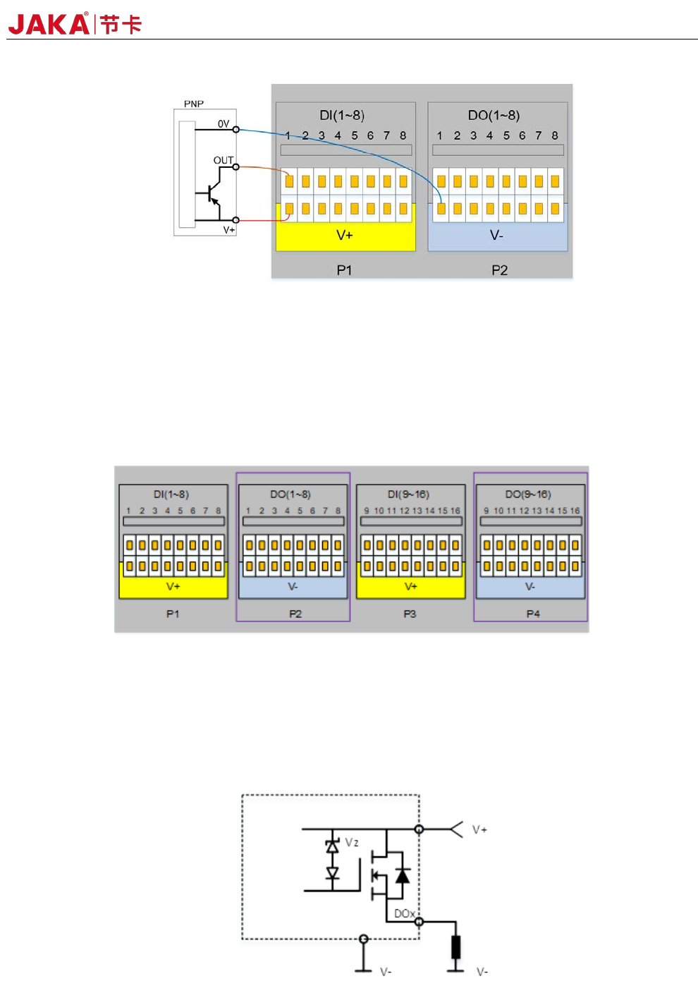 JAKA Zu 3 v 1. 1 27 . Figure 4- 10 Figure 4 - 10 sh ows the i nput wiri ng diagram of the PNP int erface. The V + pin is co nnected to V +, the OUT pin is co nnected to D Ix, and t he 0V pin is connec ted to V - . When t…