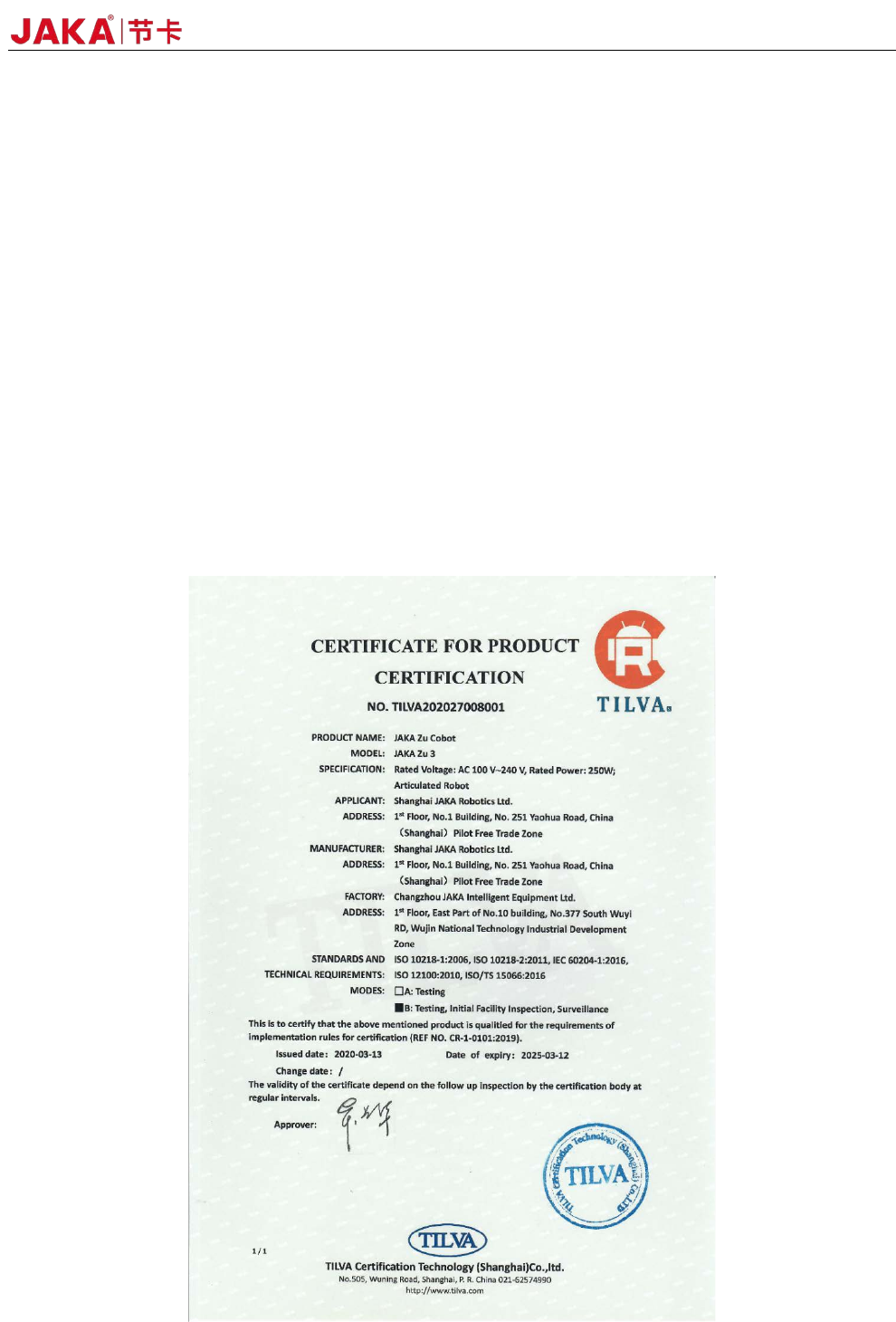 JAKA Zu 3 v 1. 1 41 6 Applied Standards and Certificates 6.1 Collabora tive Robot Certification The com pany's prod uct J A K A Z u ® 3 robot has pass ed CR cer tification and comp lies with the relevant requireme n…