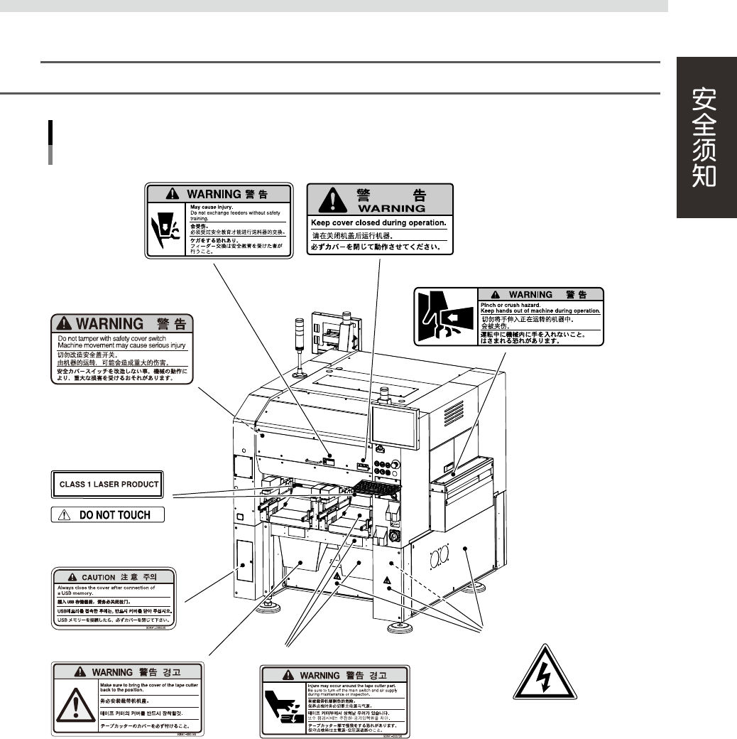 为了安全使用机器,如下图所示,在贴片机各个部位张贴了警告标贴,务必严格遵守标贴指示。