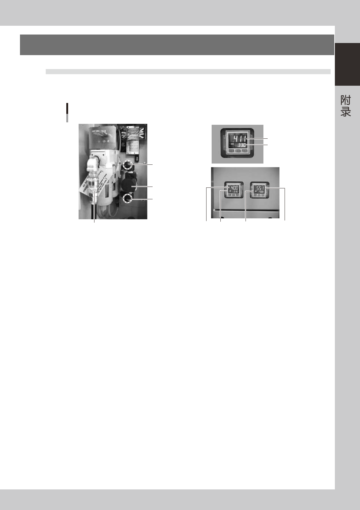 附录 目录 1. 机器规格 A- 1 1.1 气压调节部 A- 1 1.2 电源连接部 A- 2